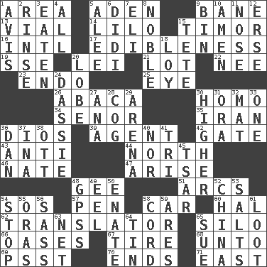 ACROSS 1. Length times width 5. Arabian gulf 9. Object of repulsion 13. Small bottle 14. _ and Stitch 15. The easternmost of the Lesser Sundas 16. International (abbr.) 17. The property of being fit to eat 19. Compass dir. 20. Flowery wreath 21. Car dealer's back yard 22. Born 23. Inside; within (prefix) 25. Sight organ 26. Phillipine bananalike plant 30. Like (prefix) 34. Sir (Sp.) 35. SW Asia republic 36. "Vaya con ____" 39. Representative 42. Yard entry 43. Against 44. 0 degrees 46. Nathan's nickname 47. Get up 48. Unit of force equal to gravity 51. Arches 54. Distress signal 57. Fenced enclosure 58. Automobile 60. Actor Linden 62. Interpreter 65. Grain storage tower 66. Fertile tracts in a desert 67. Become fatigued 68. To (old English) 69. Inconspicuous attention getter 70. Extremities 71. 90 degrees DOWN 1. Advice 2. Wash lightly 3. Consumed 4. 100% 5. Toward shelter 6. "You Light Up My Life" star Conn 7. Biblical high priest 8. Impressive in appearance 9. Storage container 10. So be it 11. Olfactory organ 12. Celtic language 15. False hair 18. Myrna of the movies 20. Ear part 24. Hyrax 27. Santa ___, CA 28. Gear tooth 29. Sports stadium 30. Having greater elevation 31. Mouth or opening 32. Floor covering 33. Single 36. One of the 12 tribes of Israel 37. _ tizzy (2 wds.) 38. Baseball player Mel 40. And not 41. Three (prefix) 45. Russian ruler of old 48. Global Positioning Systems (abbr.) 49. Snakelike fish 50. Maternal 52. Large country 53. Table seasonings 54. Halt 55. Mouths or openings 56. Backtalk 58. Drawstring 59. Ancient Greek god of war 61. Plunder 63. Fish or hair follower 64. Metal container 65. Institute legal proceedings