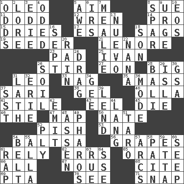 ACROSS 1. Margarine 5. Direct toward a target or goal 8. Take to court 11. Texas town _ City 12. Songbird 14. Adept person 15. Frees from moisture 17. He sold his birthright 18. Settles 19. Sowing specialist 21. Poe poem 23. Groovy apt. 25. _ the terrible 26. Disorderly outburst 27. A really long time 28. Large 31. Lion 33. Tired old horse 35. Collect or gather 37. Indian skirt 38. Set 40. Rounded earthenware pot or jar 41. Vertical member of a panel or frame 43. Snakelike fish 45. Pass on 46. Definite Article 47. Atlas unit 50. Nathan's nickname 52. Expression of disdain 53. Heredity factor (abbr.) 54. Greek mezzo-soprano Agnes 56. Wine fruits 61. Have trust in 62. Blunders 65. Declaim 66. 100% 67. Common sense 68. Quote 69. Parent Teacher Assoc. 70. Observe 71. Fastener DOWN 1. Probability 2. Old wives' tales, e.g. 3. Singer Brickell 4. Wrote a lyric poem 5. Deep reverence 6. Big collection agency 7. Ear of corn 8. Practice fight 9. Goad 10. Greek goddess of the dawn 13. New (sp.) 16. Back-to-school mo. 18. Male child 20. Water falling in drops from the sky 22. Grandmother 24. To draw with force 26. Earth 28. Indonesian resort city 29. Capri or Wight 30. Girls' org. (abbr.) 31. Thin strip of wood or metal 32. 4th largest of the Great Lakes 34. Turn to the right 36. Method 37. Fast jet (abbr.) 39. Grant temporary use of 42. Give off 44. Long (Scottish) 48. NE Netherlands city 49. N Egypt peninsula 51. Edible starchy tuberous root 52. Strand of rope, yarn or thread 54. Waist strap 55. Silent film actress Nazimova 57. Arches 58. Ache 59. Singer James 60. Ooze 61. Strike 63. Sorrow 64. Compass dir.