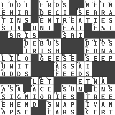 ACROSS 1. Farming town in central California 5. Greek god of love 9. Chow _ 13. Arab leader 14. Tenth: prefix 15. Spanish missionary in California 16. Metal containers 17. Pleas 19. R.R. building 20. Corn or form start 21. Erode 22. Eastern Standard Time (abbr.) 23. Indian titles of respect 25. _ Lanka 26. To get out of a bus 30. "Vaya con ____" 34. From or relating to Ireland 35. Pulitzer Prize-winning author Ferber 36. _ and Stitch 39. Honkers 42. Ooze 43. A single undivided whole 44. Slender Brazilian palm 46. Likelihood 47. Eats 48. Allow 51. Inactive volcano in Sicily 54. White ___ sheet 57. Adept person 58. Player for Phoenix 60. Followers of ems 62. Seigniories (variant) 65. Family _ (genealogy) 66. Make improvements or corrections to 67. Fastener 68. _ the terrible 69. Domed church section 70. Hearing organs 71. Sure thing DOWN 1. Allows 2. Leaves out 3. Middle Eastern gold or silver currency 4. Big collection agency 5. Genesis locale 6. Painter Guido (1575-1642) 7. Sep. follower 8. Titles for men of rank and authority 9. Was introduced to 10. 4th largest of the Great Lakes 11. Angers 12. Political cartoonist Thomas 15. Suttee (variant) 18. Ewer handle 20. One who uses or employs something 24. Foolish or stupid persons 27. Massive 28. Purpose 29. To gather and bind into a bundle 30. Stop 31. Binary compound 32. Single 33. Plant excrement 36. Nilotic language 37. Working for oneself (abbr.) 38. Flaplike covering 40. Compass dir. 41. Compass dir. 45. Arabian gulf 48. Put down 49. Environmental prefix 50. Laconic 52. Impudent aggressiveness 53. Approach 54. Toward the sea 55. Simple or foolish person 56. Ripens 58. Burn superficially 59. United States Postal Service (abbr.) 61. Emitted 63. Compass dir. 64. _ tizzy (2 wds.) 65. Nervous spasm