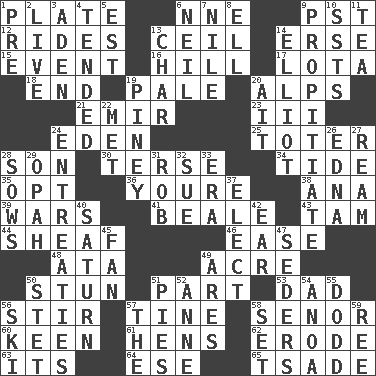 ACROSS 1. Food holder 6. Compass dir. 9. Pacific Standard Time (abbr.) 12. Amusement-park features 13. To provide with a ceiling 14. Celtic language 15. Happening 16. Land elevation 17. Globular water bottle used in Asia 18. Conclude 19. Light colored 20. High mountains 21. Arab leader 23. One more than two 24. Genesis locale 25. Carrier 28. Manchild 30. Laconic 34. Event that recurs at intervals 35. Choose 36. You are 38. Santa ___, CA 39. Armed conflicts 41. Memphis, Tenn. Street 43. Scottish cap 44. To gather and bind into a bundle 46. Relaxation 48. "One Day ___ Time" 49. Measure of real estate 50. Astound 51. Role in a play 53. June honoree 56. Use a spoon 57. Prong on a fork 58. Sir (Sp.) 60. Peachy ____! 61. Coop moms 62. Eat (away) 63. It is 64. Compass dir. 65. Sadhe (variant) DOWN 1. Before (prefix) 2. Not recorded 3. Arabian gulf 4. Watched over 5. Eastern Standard Time (abbr.) 6. Famous astronaut Armstrong 7. The longest river in the world 8. Pipe bend 9. Appease 10. Fast planes 11. Beverage made from leaves 13. Burn to charcoal 14. American author Paul (1891-1958) 19. Abounding in pines 20. Small island 22. Was introduced to 24. Pleas 26. Pulitzer Prize-winning author Ferber 27. 480, 500 or 516 sheets of paper 28. Sty mamas 29. Brightly colored fish 31. Director Reiner 32. Take to court 33. Period 37. Opt 40. Titan orbits this 42. Ewer handle 45. Avid follower 47. Spring feasts 49. Ancient Greek god of war 50. Proofreading order 51. Sliced desserts 52. Queen of England 1702-14 54. Small Philippine buffalo 55. Texas town _ City 56. What Jean-Claude Killy likes to do 57. Definite Article 58. Arrange properly for use 59. To separate or throw off
