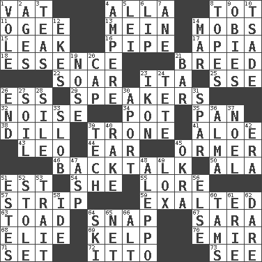 ACROSS 1. Large container 4. Silent film actress Nazimova 8. Small child 11. Double curve, resembling the letter S 13. Chow _ 14. Crowds into 15. Path through which fluid escapes 16. Corncob 17. Capital of Western Samoa 18. Center 21. A special lineage 22. Fly high 23. Call ___ day 25. Compass dir. 26. Double-curved letter 29. Orators 32. Annoying sound 34. Plant holder 35. Baking dish 38. Deli pickle 39. Heavy duty weighing machine 41. Medicinal plant 43. Lion 44. Ewer handle 45. Abalone 46. Sass 50. Wing 51. Eastern Standard Time (abbr.) 54. A female animal or person 55. Old wives' tales, e.g. 57. Empty completely 59. Honored 63. Frog relative 64. Fastener 67. "Two Mules for Sister ____" 68. Writer Wiesel 69. Seaweed 70. Independent ruler or chieftain 71. Put into a specified state 72. "Tell ____ the Marines!" 73. Observe DOWN 1. Grand slam 2. Matures 3. Beverages made from leaves 4. Electrical Unit 5. Flowery wreath 6. Mouth edge 7. A saturated hydrocarbon 8. Drinks excessively 9. Off-Broadway awards 10. Sadhe (variant) 12. Supplements with great effort 14. Make imperfect 19. Sense of smell 20. Head covering 21. Drinking establishment 23. Picture 24. False hair 26. Conclude 27. Land 28. Drop; flow; fall 30. To the left, to Queeg 31. Practice fight 33. Messy guy 36. _ mater 37. Christmas carol 39. Technical 40. Libertine 42. Period 45. Gumbo ingredient 47. Cleo's killer 48. City in Syria 49. Brine-cured salmon 51. _____ Park, CO 52. Took without asking 53. Distinguishing feature 56. Otherwise 58. Binary compound 60. Scottish caps 61. 4th largest of the Great Lakes 62. Have the gumption 64. What Jean-Claude Killy likes to do 65. Fish or hair follower 66. Keyboard modifier key