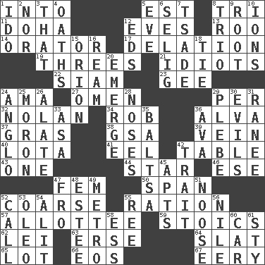 ACROSS 1. To the inside or interior of 5. Eastern Standard Time (abbr.) 8. Three (prefix) 11. Capital of the state of Qatar 12. Nights before holidays 13. Friend of Pooh 14. Speaker 17. Accusation by an informer 19. Triplets 21. Foolish or stupid persons 22. Thailand, formerly 23. Unit of force equal to gravity 24. Wet nurse (var.) 27. Sign of things to come 29. For each 32. Pitcher Ryan 34. Director Reiner 36. Inventor's middle name 37. Pate de foie ____ 38. Girls' org. (abbr.) 39. Distinctive style or manner 40. Globular water bottle used in Asia 41. Snakelike fish 42. Eating place 43. Single 44. Play the lead 46. Compass dir. 47. Opposite of masc. 50. Connect, as a bridge 52. Unrefined 55. Food allowance for one day 57. One to whom something is allotted 59. Unemotional ones 62. Luau accessory 63. Celtic language 64. Narrow board 65. Car dealer's back yard 66. Greek goddess of the dawn 67. Suggestive of the supernatural DOWN 1. Wedding promise 2. Not either 3. Not this but _ 4. Profane or obscene expressions 5. Night before a holiday 6. Former Milwaukee Brewers owner Bud 7. Sadhe (variant) 8. Musical group of three 9. Carrot, for example 10. Charged particles 12. Begley and Asner 15. Constellation of myth 16. 480, 500 or 516 sheets of paper 18. Make a knot 20. Develop 24. White American of non-Hispanic descent 25. Person of subnormal intelligence 26. Having winglike extensions 28. Olfactory organs 29. First-year military academy student 30. Vices 31. Indian princess (variant) 33. White ___ sheet 35. Greek mezzo-soprano Agnes 36. Actress Gardner 42. Distinguishing feature 45. Tenement units (abbr.) 47. Back 48. First name in cosmetics 49. Paris' subway 51. Trap for birds or small mammals 52. Give a ring to 53. Butter sub 54. Set down 55. To sift 56. "Death on the ____" 58. Double-curved letter 60. Auto 61. Filthy place