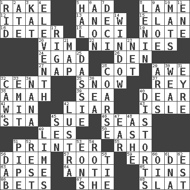 ACROSS 1. Immoral or dissolute person 5. Possessed 8. Unable to walk 12. Slanted text style (abbr.) 13. Afresh 15. Liveliness 16. Prevent from occurring 18. Event scenes 19. Make mention of 20. Zeal 22. Fools 24. Mild oath 26. Lair 27. California wine valley 28. Small bed 29. Deep reverence 32. Penny 35. Frozen precipitation 37. Marina Del _, California 38. Wet nurse 39. Ocean 40. Letter starter 41. Victory 42. One who doesn't tell the truth 43. Small island 44. R.R. building 45. Take to court 46. Oceans 49. French article 50. Compass direction 51. Hard copy producer 55. 17th letter of the Greek alphabet 56. South Vietnam president (1954) 57. Carrot, for example 59. Wear away 63. Domed church section 64. Opposed to 65. Canisters 66. Wagers 67. A female animal or person 68. Narrow board DOWN 1. To free from 2. Had dinner 3. Krazy ___ of comics 4. Veterans Day date 5. Actor Linden 6. Soon (poet.) 7. Tenth: prefix 8. Soviet premier 1918-24 9. _ vera 10. Floor coverings 11. Compass dir. 14. Light entry point 17. Port city in Latvia 21. Atlas unit 23. Fish or hair follower 25. Small ungulate mammals of Africa 28. Rough 29. Ancient Greek god of war 30. Welt 31. Jane of fiction 32. Crow sounds 33. Send forth 34. Nanny 36. Teachers' org. 40. What propaganda does 42. A period of five years 45. Elected rep. 47. Ewer handle 48. American tennis player Robert 49. Citrus fruits 51. Corncob 52. Take ten 53. Immeasurably long periods of time 54. Writer of Portnoy's Complaint (1969) 56. Pat or tap gently 58. Make a knot 60. Lubricate 61. Heredity factor (abbr.) 62. Eastern Standard Time (abbr.)