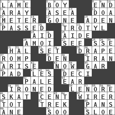 ACROSS 1. Unable to walk 5. Male child 8. Conclude 11. Like ___ of sunshine 12. At sea 14. ___ good deed 15. Distance measurement 17. Went 18. Arabian gulf 19. Went by 21. TNT 23. Assist 25. Assistant 26. Mine, in Marseilles 27. Perceive with the eye 28. Compass dir. 31. Actor Linden 33. Put into a specified state 35. Window treatment 37. Frolic 38. Lair 40. SW Asia republic 41. Get up 43. At this time 45. Slender fish 46. Groovy apt. 47. French article 50. Tenth: prefix 52. Light colored 53. Hearing organ 54. Pressed 56. Poe poem 61. Three-handed card game 62. Penny 65. One who wires 66. Small child 67. Long journey 68. Baking dishes 69. One (Scot) 70. "Barney Miller" actor Jack 71. _ gin DOWN 1. Desk light 2. Type of rug 3. Floor protectors 4. Snake ____ (dice throw) 5. Container for groceries 6. Bear (Spanish) 7. Gossips 8. Whirlpool 9. Christmas carol 10. Daniel's nick name 13. Nest on high 16. 480, 500 or 516 sheets of paper 18. Had dinner 20. "Vaya con ____" 22. Wrote a lyric poem 24. Passed on 26. High mountains 28. "Two Mules for Sister ____" 29. Coast Guard woman 30. Car or cant ending 31. Israeli folk dance 32. Among 34. Nine, plus one 36. Swiss mountan, "Queen of the Mountains" 37. Reproach for some lapse or misdeed 39. Connecting point 42. Liveliness 44. Welt 48. Voters do this 49. Spring feasts 51. Ship's personnel 52. Cooking vessel 54. Image 55. Pace 57. Pinches, bites 58. Taken by mouth 59. Former U.S. Attorney General Janet 60. Celtic language 61. R.R. building 63. Modern: prefix 64. Ring climax
