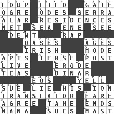 ACROSS 1. Central Nebraska county 5. _ and Stitch 9. Yard entry 13. Legendary monster 14. Lyric poems 15. Father Junipero _ 16. Having or resembling wings 17. Homes 19. Remaining after all deductions 20. Ocean 21. Compass dir. 22. Perceive with the eye 23. Gouge 25. Strike 26. Fertile tracts in a desert 30. Eons 34. From or relating to Ireland 35. Method 36. Flats, for short 39. Laconic 42. Mail 43. Not recorded 44. Eat (away) 46. Beverages made from leaves 47. Middle Eastern gold or silver currency 48. Greek goddess of the dawn 51. Shout 54. Institute legal proceedings 57. Falsehood 58. Part of HMS, perhaps 60. Electrically charged atom 62. Interpreter 65. Conductor's collection 66. Match 67. Not wild 68. Conclusions 69. Nanny 70. Institutes legal proceedings 71. Vertical spar for supporting sails DOWN 1. Grant temporary use of 2. Stared 3. A salt of uric acid 4. For each 5. Old wives' tales, e.g. 6. It may be bright or harebrained 7. French article 8. Flexible twig of a willow tree 9. Commissioned military rank (abbr.) 10. Arches 11. Family _ (genealogy) 12. Comfort 15. Ooze 18. Heredity factor (abbr.) 20. Play the lead 24. Annoying sounds 27. Be seated 28. Compass dir. 29. Tear up 30. Electrical Unit 31. Thick or sticky substance 32. Begley and Asner 33. Arrange properly for use 36. The first octave above the treble staff 37. Sliced dessert 38. Federal power corp. 40. Indian title of respect (Mr.) 41. A really long time 45. 24-hour periods 48. Otherwise 49. Lubricate 50. Theater features 52. Woody, climbing, usually tropical plant 53. Nobles 54. Comedian Laurel of Laurel & Hardy 55. Capital and largest city of Mongolia 56. Merit 58. Dwelling 59. Angers 61. A home for chicks 63. Teachers' org. 64. The 19th letter of the Greek alphabet 65. Opposite of masc.