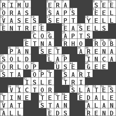 ACROSS 1. Tall New Zealand timber tree 5. Period 8. Perceive with the eye 11. Mouths or openings 12. Plant excrements 14. Snakelike fish 15. Flower holders 17. Back-to-school mo. 18. Shout 19. Main course 21. Artist's stands 23. Gear tooth 25. Tenement units (abbr.) 26. Inactive volcano in Sicily 27. 17th letter of the Greek alphabet 28. Director Reiner 31. Baking dish 33. Put into a specified state 35. Sports stadium 37. Disposed of to a purchaser 38. Pet locale 40. South American Indian 41. Lowest deck of a ship 43. Purpose 45. Unit of force equal to gravity 46. R.R. building 47. Elect 50. Indian skirt 52. Small island 53. Three (prefix) 54. Winning man's name 56. Chalkboards 61. Prong on a fork 62. Wig 65. Peak District village in England 66. Large container 67. Comedian Laurel of Laurel & Hardy 68. Actor Alda or Thicke 69. Everything 70. Begley and Asner 71. Tear apart DOWN 1. Be footloose 2. SW Asia republic 3. Vertical spar for supporting sails 4. One who uses or employs something 5. Double-curved letter 6. Actress Charlotte 7. Become visible 8. Stitch closed the eyes of (a falcon) 9. Snakelike fish 10. Pipe bend 13. Staphylococcus 16. Religious group 18. It is so 20. Immeasurably long periods of time 22. Portico 24. Highlander 26. Inside; within (prefix) 28. French philosopher Descartes 29. At one time in the past 30. Sound made by sheep 31. Left side of a ship or aircraft 32. Silent film actress Nazimova 34. The 19th letter of the Greek alphabet 36. Swiss mountan, "Queen of the Mountains" 37. Mayday 39. Inconspicuous attention getter 42. Mail 44. Hearing organs 48. Graphs 49. Cylindrical with tapered ends 51. Cause heat under the collar 52. Frozen water 54. Small bottle 55. International (abbr.) 57. The sixth month of the Jewish calendar 58. Lie 59. Enthusiasm 60. Transmit 61. Federal power corp. 63. Bit 64. Followers of ems