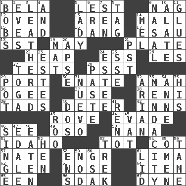 ACROSS 1. Actor Lugosi 5. For fear that 9. Tired old horse 12. Baking chamber 13. Type of rug 14. Shopping center 15. Necklace unit 16. Mild oath, euphamism for damn 17. Son of Isaac 18. Fast jet (abbr.) 19. Can I? 21. Food holder 22. Pile 24. Double-curved letter 26. French article 27. Trials 28. Inconspicuous attention getter 29. Sweet dark-red dessert wine 30. Related on the mother's side 32. Nursemaid 36. Double curve, resembling the letter S 37. Purpose 38. Painter Guido (1575-1642) 39. Bits 40. Prevent from occurring 42. Taverns 43. Be footloose 44. Elude 46. Perceive with the eye 49. Bear (Spanish) 50. Nanny 51. Potato state 53. Small child 54. Small bed 57. Nathan's nickname 58. Engineer (abbr.) 61. Pale green bean 62. Small, secluded valley 63. Sense of smell 64. Detail 65. Car or cant ending 66. Neighbor of Neb. 67. Unit of force DOWN 1. Moves up and down 2. Nights before holidays 3. Resembling or made to resemble leather 4. Added to 5. Kenny Rogers chart-topper in '80 6. Epoch 7. Elected rep. 8. Label 9. Rhinal 10. Having winglike extensions 11. Cements 14. Cartoonist voice _ Blanc 19. Floor protector 20. Domed church section 21. Pacific Standard Time (abbr.) 23. _____ Park, CO 24. First name in cosmetics 25. Compass dir. 27. Ancient Roman robe 28. Thick mixture 29. Plant holder 31. New (sp.) 32. Believer in; advocate of (suffix) 33. Ananias' fault 34. Singer Murray 35. Part of HMS, perhaps 40. Two (Sp.) 41. Western Nevada city 43. Friend of Pooh 45. Large container 46. Scorch 47. Peak District village in England 48. Consumed 52. Layer 53. Long journey 55. Presage 56. Docile 58. Followers of ems 59. Allow head to fall sleepily 60. Girls' org. (abbr.) 61. Flaplike covering