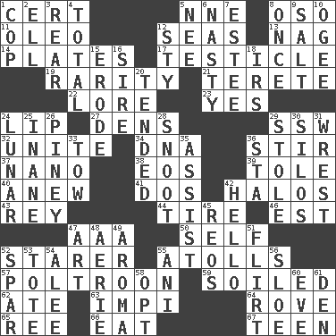 ACROSS 1. Sure thing 5. Compass dir. 8. Bear (Spanish) 11. Butter sub 12. Oceans 13. Tired old horse 14. Food holders 17. A testis 19. Noteworthy scarcity 21. Cylindrical with tapered ends 22. Old wives' tales, e.g. 23. Affirmative reply 24. Mouth edge 27. Hiding places for outlaws 29. Compass dir. 32. Join together 34. Heredity factor (abbr.) 36. Move through with a circular motion 37. Billionth: prefix 38. Greek goddess of the dawn 39. Lacquered or enameled metalware 40. Afresh 41. Two (Sp.) 42. Auras 43. Marina Del _, California 44. Hoop that covers a wheel 46. Eastern Standard Time (abbr.) 47. Auto club (abbr.) 50. Automatic 52. A viewer who gazes fixedly 55. Ringlike coral islands and reefs 57. Coward 59. Dirtied 62. Had dinner 63. Body of Kaffir warriors 64. Be footloose 65. Portuguese money of account (variant) 66. Ingest 67. Adolescent DOWN 1. Police officer (slang) 2. Pipe bend 3. Hitchcock's "____ Window" 4. "_____ Recall" 5. Born 6. Thoroughly unpleasant 7. First name in cosmetics 8. Single time 9. Table seasoning 10. Double curve, resembling the letter S 12. Filthy place 15. Wear away 16. The founder of a family 18. Big collection agency 20. Watched over 24. Type of eclipse 25. Silly 26. Abounding in pines 28. Snout, nose 29. Fur scarf 30. Grain storage towers 31. Obtain by seizing forcibly or violently 33. Pull behind 35. Help 36. R.R. building 42. Phone greeting 45. Vintage cars 47. Nonscientific branch of learning 48. Nest on high 49. Odor 51. Seductive woman who exploits men 52. Practice fight 53. Carryall 54. Toward shelter 55. Black tropical American cuckoo 56. A type of plum 58. Choose 60. First lady 61. Lair