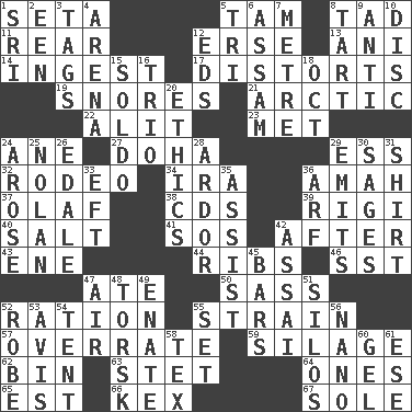 ACROSS 1. Stalk of a moss capsule 5. Scottish cap 8. Small amount or degree 11. Tail end 12. Celtic language 13. Cuckoo 14. Consume 17. What propaganda does 19. Sounds asleep 21. Northern region 22. Set down 23. Was introduced to 24. One (Scot) 27. Capital of the state of Qatar 29. Curvy letter 32. Cowboy competition 34. Retirement account (abbr.) 36. Nursemaid 37. Norwegian king 38. Music discs 39. Swiss mountan, "Queen of the Mountains" 40. Table seasoning 41. Distress signal 42. Following 43. Compass dir. 44. Chest bones 46. Fast jet (abbr.) 47. Had dinner 50. Backtalk 52. Food allowance for one day 55. Put through a sieve 57. Make much ado about nothing 59. Fodder prepared in a silo 62. Storage container 63. Proofreading order 64. Washington bills 65. Eastern Standard Time (abbr.) 66. Dry husk or covering 67. Flatfish DOWN 1. Indian title of respect (Mr.) 2. Car or cant ending 3. Labels 4. Sports stadium 5. Three (prefix) 6. Indian state 7. Distance measurement (Brit.) 8. Small pie 9. Against 10. Compact _ 12. Begley and Asner 15. Twentieth part of a lira 16. Musical group of three 18. Sep. follower 20. Principles of right and wrong 24. Came up 25. Pitcher Ryan 26. Peak District village in England 28. Zeal 29. Gives off 30. Gurus 31. Upper-body garment 33. Lizard (obsolete) 35. Help 36. Sandy's bark 42. Slender Brazilian palm 45. Oblong pieces of solid material 47. Atmosphere 48. Cod relative 49. Related on the mother's side 51. Grain storage towers 52. Loose flowing garment 53. Opinion 54. Portable shelter 55. Put into a specified state 56. Billionth: prefix 58. John Ritter's dad 60. Set 61. Compass dir.