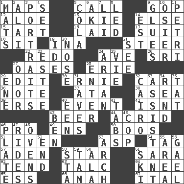 ACROSS 1. Atlas contents 5. Give a ring to 9. Republican Party 12. Medicinal plant 13. Migrant worker of the '30s 14. Otherwise 15. Small pie 16. Put down 17. Costume for a special activity 18. Be seated 19. _ tizzy (2 wds.) 21. Navigate 22. Redecorate 24. "___ Maria" 26. Indian title of respect (Mr.) 27. Fertile tracts in a desert 28. 4th largest of the Great Lakes 29. Prepare for publication 30. Bert's buddy 32. Draw slowly or heavily 36. Musical sound 37. _ moment's notice (2 wds.) 38. At sea 39. Celtic language 40. Incident 42. Is not 43. Fermented drink made from hops 44. Bitter 46. Adept person 49. Followers of ems 50. Expressions of contempt or scorn 51. Make or become more lively 53. Viper 54. Label 57. Arabian gulf 58. Play the lead 61. "Two Mules for Sister ____" 62. Look after 63. Baby powder 64. Leg joint 65. Double-curved letter 66. Wet nurse 67. Slanted text style (abbr.) DOWN 1. Floor protectors 2. Mountain range southwest of Kyrgyzstan 3. Likenesses of persons 4. Put into a specified state 5. Root beer relative 6. Alias (abbr.) 7. Cards in a Roman deck? 8. Directed 9. Cements 10. Flexible twig of a willow tree 11. _ dish (used to culture cells) 14. Eastern Standard Time (abbr.) 19. Binary compound 20. Characteristic smell of wine 21. Observe 23. First name in cosmetics 24. Believer in; advocate of (suffix) 25. Compete 27. Scent 28. Keyboard key 29. Compass dir. 31. All-night dance parties 32. Capital of Egypt 33. Helper 34. Tear apart 35. Make lace 40. Car or cant ending 41. Bar bills 43. Benjamin's nick name 45. Police officer (slang) 46. Food holder 47. Amusement-park features 48. Baking chambers 52. Conclude 53. Bowlike part 55. Length times width 56. Highlander 58. R.R. building 59. Scottish cap 60. In the manner of 61. What Jean-Claude Killy likes to do