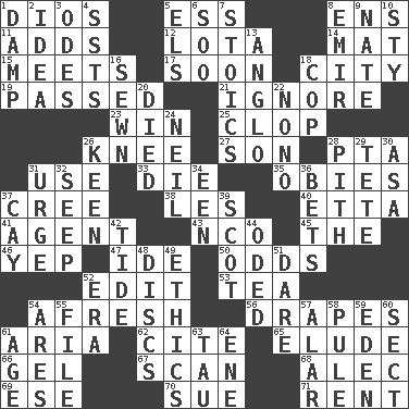 ACROSS 1. "Vaya con ____" 5. Curvy letter 8. Followers of ems 11. Sums up 12. Globular water bottle used in Asia 14. Floor covering 15. Confronts 17. Within a short period 18. Municipality 19. Went by 21. Refuse to acknowledge 23. Victory 25. Hoof sound 26. Leg joint 27. Boy, to dad 28. Parent Teacher Assoc. 31. Purpose 33. Expire 35. Off-Broadway awards 37. Algonquian 38. French article 40. Singer James 41. Rep 43. Non-commissioned officer (abbr.) 45. Definite Article 46. Slangy assent 47. Binary compound 50. Likelihood 52. Prepare for publication 53. Afternoon social gathering 54. Anew 56. Window treatments 61. Operatic vocal solo 62. Quote 65. Evade 66. Set 67. Skim 68. Actor Baldwin 69. Compass dir. 70. Institute legal proceedings 71. Monthly bill DOWN 1. Moist 2. The content of cognition 3. Lyric poems 4. Fast planes 5. Raised railways 6. "Barney Miller" actor Jack 7. Unemotional ones 8. Independent ruler or chieftain 9. Nathan's nickname 10. Filthy place 13. White American of non-Hispanic descent 16. Stitched 18. Police officer (slang) 20. Passed on 22. Words to Nanette 24. Famous astronaut Armstrong 26. Peachy ____! 28. Heart or essence 29. False hair 30. White ___ sheet 31. Goad 32. Ooze 34. Car or cant ending 36. Wagers 37. Island 39. Highlander 42. Event that recurs at intervals 44. Wrote a lyric poem 48. Plates 49. Principles of right and wrong 51. Have the gumption 52. Epoch 54. Ancient Greek god of war 55. Do some clerical work 57. Having or resembling wings 58. Whimper 59. Genesis locale 60. Religious group 61. Grow older 63. The 19th letter of the Greek alphabet 64. Compass dir.