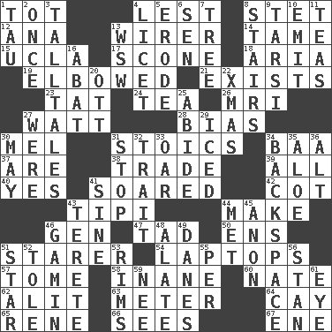 ACROSS 1. Small child 4. For fear that 8. Proofreading order 12. Santa ___, CA 13. One who wires 14. Docile 15. Southern CA. univ. 17. Biscuitlike quick bread 18. Roberta Peters solo 19. Turned at an angle; bent 21. Is 23. Make lace 24. Beverage made from leaves 26. Medical imaging device (abbr.) 27. Electrical Unit 28. Prejudice 30. Cartoonist voice _ Blanc 31. Unemotional ones 34. Sound made by sheep 37. "We ___ not amused" (Victoria) 38. Buy and sell 39. 100% 40. It is so 41. Flew 42. Small bed 43. Native american tent (variation) 44. Cause to be 46. Commissioned military rank (abbr.) 47. Small amount or degree 50. Followers of ems 51. A viewer who gazes fixedly 54. Portable computers 57. Heavy book 58. Empty; void 60. Nathan's nickname 62. Came down and settled, as after flight 63. Distance measurement 64. Island 65. French philosopher Descartes 66. Perceives with the eye 67. Compass dir. DOWN 1. The 19th letter of the Greek alphabet 2. At one time in the past 3. Baron Munchausen's specialties 4. It is permitted: Lat. 5. Wear away 6. Elected rep. 7. Relationship diagram 8. Flight of steps 9. Tarsus (plural) 10. Give off 11. Beverages made from leaves 13. Compass dir. 16. Blind as ____ 20. Baseball player Mel 22. Dec. holiday 25. Remain 27. We are 29. On the rocks 30. Can I? 31. Obstruct or block passage 32. Distinguishing feature 33. Boat paddle 34. Keyboard key 35. _ vera 36. The first octave above the treble staff 41. Trig term 43. Cigar-shaped 44. Was introduced to 45. Soon (poet.) 46. Homeless child 48. Having winglike extensions 49. Natives or inhabitants of Denmark 51. Play the lead 52. Lacquered or enameled metalware 53. Basketball hoops 55. For each 56. Comedian Laurel of Laurel & Hardy 59. Born 61. Sight organ