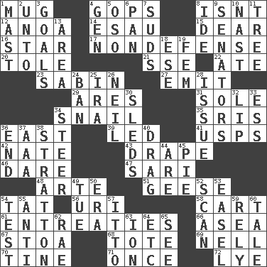 ACROSS 1. Large cup 4. Republicans 8. Is not 12. Small Philippine buffalo 14. He sold his birthright 15. Letter starter 16. Play the lead 17. Unrelated to defense, as in spending 20. Lacquered or enameled metalware 21. Compass dir. 22. Had dinner 23. Unit of acoustic absorption 27. Send forth 29. Ancient Greek god of war 31. Not divided or shared with others 34. Slow-paced one 35. Indian titles of respect 36. Compass direction 39. Directed 41. United States Postal Service (abbr.) 42. Nathan's nickname 43. Window treatment 46. Have the gumption 47. Indian skirt 48. Johnson of "Laugh-In" 51. Honkers 54. Make lace 56. RI univ. 58. Draw slowly or heavily 61. Pleas 66. At sea 67. Portico 68. Haul 69. 1994 drama film starring Jodie Foster 70. Prong on a fork 71. Single time 72. Potassium hydroxide DOWN 1. Vertical spar for supporting sails 2. To (old English) 3. Scores awarded for successful feats 4. Commissioned mil. rank 5. Bear (Spanish) 6. Baking dish 7. Soap bubbles 8. Binary compound 9. Legislators 10. Political cartoonist Thomas 11. Family _ (genealogy) 13. Type of rug 18. Compass dir. 19. Opposite of masc. 24. Forbid 25. Retirement account (abbr.) 26. Famous astronaut Armstrong 28. Come out of 30. Bobsleighs 32. Mouth edge 33. Double-curved letter 34. Navigate 36. Conclusion 37. Auto club (abbr.) 38. Ski resort town in Vermont 40. To draw with force 44. "We ___ not amused" (Victoria) 45. Sliced dessert 49. Third day of the wk. 50. Period 52. Skim 53. Artist's stand 54. Trial 55. Opposed to 57. "Tell ____ the Marines!" 59. Have confidence or faith in 60. Lie 62. Actress Charlotte 63. Electrically charged atom 64. And so on (abbr.) 65. Observe