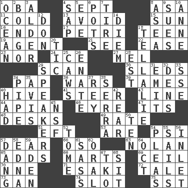 ACROSS 1. Chief or king in Benin or Nigeria 4. Back-to-school mo. 8. White ___ sheet 11. Lacking warmth 13. Prevent the occurrence of 15. Player for Phoenix 16. Inside; within (prefix) 17. _ dish (used to culture cells) 18. Adolescent 19. Representative 21. Observe 22. Comfort 23. And not 24. Frozen water 27. Cartoonist voice _ Blanc 29. Skim 30. Bobsleighs 34. Infant food 36. Armed conflicts 39. Makes less strong or intense 40. Hub of activity 41. Guide 43. Actor's bit 44. Bee-related 46. Jane of fiction 47. It is 48. Writing tables 49. Assign a rank or rating to 51. Bank Draft (abbr.) 53. "We ___ not amused" (Victoria) 54. 23rd letter of the Greek alphabet 57. Letter starter 60. Bear (Spanish) 63. Pitcher Ryan 65. Sums up 66. Shops 69. To provide with a ceiling 70. Compass dir. 71. 1973 Nobel Price Winner (Physics) Leo 72. Story 73. Separate the seeds from cotton 74. Notch 75. Fast jet (abbr.) DOWN 1. Sea 2. Beat drum 3. Tree or shrub in the Birch family 4. Plant excrement 5. Night before a holiday 6. Cooking vessels 7. Hoop that covers a wheel 8. At sea 9. Takes to court 10. Queen of England 1702-14 12. Spanish title 14. South Vietnam president (1954) 18. Copy Pinocchio 20. Nervous spasm 25. Crow sounds 26. Related on the mother's side 28. Eastern Standard Time (abbr.) 29. Orators 31. Give off 32. Cub Scout units 33. Compass dir. 34. Corncob 35. Deliberation 37. Marina Del _, California 38. Father Junipero _ 40. Possessed 42. Stern 45. Overdraft (abbr.) 50. "___ Little Indians" 52. Heavy book 54. Entreaties 55. Moves on water 56. An arm off of a larger body of water 57. Mild oath, euphamism for damn 58. Pulitzer Prize-winning author Ferber 59. Arabian gulf 61. Backtalk 62. Relating to the mouth 64. Sep. follower 67. Ring climax 68. Be seated