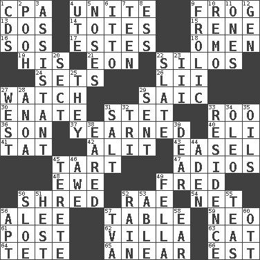 ACROSS 1. Accounting whiz (abbr.) 4. Join together 9. Toadlike animal 13. Two (Sp.) 14. Hauls 15. French philosopher Descartes 16. Mayday 17. _____ Park, CO 18. Sign of things to come 19. Part of HMS, perhaps 21. A really long time 22. Grain storage towers 24. Arranges properly for use 26. Cards in a Roman deck? 27. Observe 29. Ketch in the Levant 30. Maternal 31. Proofreading order 33. Friend of Pooh 36. Manchild 37. Felt deep pity or tenderness 40. Connecticut Ivy Leaguer 41. Make lace 42. Set down 43. Artist's stand 45. Small pie 47. Goodbye (Sp.) 48. She-sheep 49. Flintstone 50. Fragment 52. Actress Charlotte 54. Remaining after all deductions 56. Toward shelter 57. Eating place 59. Modern: prefix 61. Mail 62. Country residence 63. Feline 64. False hair 65. Approach 66. Eastern Standard Time (abbr.) DOWN 1. Music discs 2. "Silly old bear" 3. Helper 4. Shoshoni 5. Olfactory organs 6. "Tell ____ the Marines!" 7. Adolescent 8. Double-curved letter 9. Play 10. San ____ (Riviera town) 11. Singles 12. Commissioned military rank (abbr.) 20. Religious group 22. Chalkboard 23. One more than two 25. Those things 27. Compass direction 28. Small Philippine buffalo 29. Posted 31. Table seasoning 32. Three (prefix) 33. Dwelling 34. Butter sub 35. Lubricates 38. Having ears or earlike features 39. Letter starter 44. Arabian gulf 45. Cylindrical with tapered ends 46. Deep reverence 49. Chap (slang) 50. A type of plum 51. Command 52. Water falling in drops from the sky 53. Competent 55. Afternoon social gatherings 56. Fitting 57. Federal power corp. 58. Hearing organ 60. Baseball player Mel
