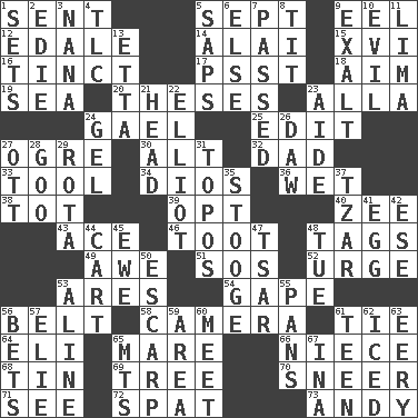 ACROSS 1. Posted 5. Back-to-school mo. 9. Snakelike fish 12. Peak District village in England 14. Jai ____ 15. 16 16. Colored lightly or faintly 17. Inconspicuous attention getter 18. Direct toward a target or goal 19. Ocean 20. College papers 23. Silent film actress Nazimova 24. Highlander 25. Prepare for publication 27. Legendary monster 30. The first octave above the treble staff 32. June honoree 33. Utensil 34. "Vaya con ____" 36. Dripping 38. Small child 39. Elect 40. Last letter of the English alphabet 43. Adept person 46. A blast of a horn 48. Labels 49. Deep reverence 51. Distress signal 52. Goad 53. Ancient Greek god of war 54. Open wide 56. Waist strap 58. Device for capturing images 61. Standoff 64. Biblical high priest 65. Female horse 66. Sibling's daughter 68. Shallow baking pan 69. Family _ (genealogy) 70. Scornful expression 71. Observe 72. Argument over a trivial matter 73. Actor Griffith DOWN 1. Arranges properly for use 2. Singer Brickell 3. Nanny 4. Affectionate concern, for short 5. Plant excrements 6. Otherwise 7. Went by 8. Teat (slang) 9. Glorify 10. Tending to cause great harm 11. Pale green bean 13. Singer James 21. Froth on beer 22. American author Paul (1891-1958) 23. Assistant 24. Set 26. Simpleton 27. Baseball player Mel 28. Thick or sticky substance 29. Round or rotation of duties 31. Literary convention 35. Moe Howard, for one 37. Czar 41. Oval reproductive body of a fowl 42. Compass dir. 44. Draw slowly or heavily 45. She-sheep 47. Russian ruler of old 48. Third day of the wk. 50. Fortification 53. Place in a line 55. Baking dishes 56. Stakes 57. Writer Wiesel 59. Type of rug 60. Rendezvous 61. Adolescent 62. On the rocks 63. Suggestive of the supernatural 65. Mountains (abbr.) 67. _ tizzy (2 wds.)