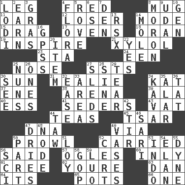ACROSS 1. Part of a journey 4. Flintstone 8. Large cup 11. Boat paddle 12. Failure 14. Method 15. To trail on the ground 17. Baking chambers 18. NW Algerian seaport 19. Stimulate to action 21. Xylene (variant) 23. R.R. building 24. Car or cant ending 25. Sense of smell 27. Fast planes 30. Player for Phoenix 31. Ear of corn 34. Krazy ___ of comics 37. Compass dir. 38. Sports stadium 39. In the manner of 40. Curvy letter 41. Spring feasts 43. Large container 44. Afternoon social gatherings 45. Russian ruler of old 47. Heredity factor (abbr.) 49. By way of 50. Move like a hungry wolf 52. Borne 56. Expressed in words 57. Stares 60. Inwardly 61. Algonquian 62. You are 63. One of the 12 tribes of Israel 64. It is 65. Cooking vessels 66. Single DOWN 1. Farming town in central California 2. Merit 3. Pate de foie ____ 4. Plants 5. Be footloose 6. Compass dir. 7. Lair 8. Person of subnormal intelligence 9. Hereditary estate 10. Commissioned military rank (abbr.) 13. Acura sports coupe 14. Undercover agent 16. Global Positioning Systems (abbr.) 20. A whole individual unit 22. Affirmative reply 25. Religious women 26. Washington bills 27. Bobsleighs 28. Trig term 29. Pull apart 30. Perceive with the eye 32. Relaxation 33. Type of rug 34. Polynesian shrub of the pepper family 35. Having or resembling wings 36. Make lace 42. Move through with a circular motion 44. The 23rd letter of the Hebrew alphabet 46. Indian skirt 47. Frees from moisture 48. Connecting point 49. Flower holders 50. Piece 51. Myrna of the movies 52. Foregone conclusion 53. Southeast Asian peninsula 54. Flair 55. Centimeter-gram-second unit of force 56. _-fi 58. Grand Old Party 59. Nilotic language