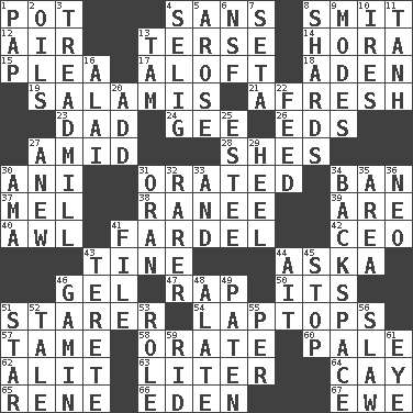 ACROSS 1. Cooking vessel 4. Without 8. Stricken, poetically 12. Wind 13. Laconic 14. Israeli folk dance 15. Entreaty 17. Upward 18. An important port of Yemen 19. Deli grouping 21. Anew 23. Male parent 24. Turn to the right 26. Begley and Asner 27. Among 28. "______ My Girl" (Turtles hit) 30. Cuckoo 31. Spoke pompously 34. Prohibit 37. Cartoonist voice _ Blanc 38. The wife of a rajah (variant) 39. "We ___ not amused" (Victoria) 40. Leather borer 41. Burden 42. Corporate head (abbr.) 43. Prong on a fork 44. "____ silly question..." 46. Set 47. Hit sharply and swiftly 50. It is 51. A viewer who gazes fixedly 54. Portable computers 57. Not wild 58. Declaim 60. Light colored 62. Set down 63. 61 cubic inches 64. Island 65. French philosopher Descartes 66. Locale of original sin 67. She-sheep DOWN 1. Infant food 2. Petroleums 3. Excercise machine 4. Former Milwaukee Brewers owner Bud 5. Came up 6. Science/research agcy. 7. Bristle 8. Broken pieces 9. Methods 10. Angers 11. Hyperbolic tangent 13. Scottish cap 16. Jai _ 20. Say or write further 22. Nourish 25. First name in cosmetics 27. Afresh 29. Person who is morally reprehensible 30. Nanny (var.) 31. Northwest Algerian city 32. Less widely known 33. Also 34. Keyboard key 35. Type of rug 36. Modern: prefix 41. Do some clerical work 43. Cigar-shaped 44. Small island 45. Discontinue 46. Homeless child 48. Having winglike extensions 49. Eucharist need 51. Play the lead 52. Lie 53. Hero or heavy, e.g. 55. For each 56. Cole _ (cabbage dish) 59. To free from 61. Sight organ