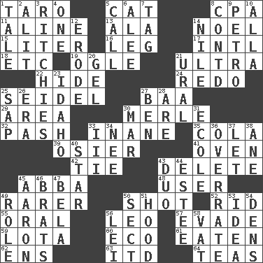 ACROSS 1. Edible starchy tuberous root 5. Domesticated feline 8. Accounting whiz (abbr.) 11. Place in a line 13. Chicken ___ king 14. Christmas carol 15. 61 cubic inches 16. Part of a journey 17. International (abbr.) 18. And so on (abbr.) 19. Stare 21. Extreme 22. Flintstone garb 24. Make new 25. Beer mug 27. Sound made by sheep 29. Type of rug 30. Haggard of country music 32. Romantic infatuation 33. Lacking in sense or substance 35. Root beer relative 39. Flexible twig of a willow tree 41. Baking chamber 42. Standoff 43. Erase 45. Swedish rock group 48. One who uses or employs something 49. More uncommon 50. Opportunity 52. To free from 55. Of the mouth 56. Lion 57. Elude 59. Globular water bottle used in Asia 60. Environmental prefix 61. Consumed 62. Followers of ems 63. It would 64. Afternoon social gatherings DOWN 1. Story 2. Came down and settled, as after flight 3. Actors Guy, Robert Welles, and Clint 4. Single 5. Give a ring to 6. Toward shelter 7. Label 8. Continued (abbr.) 9. Stone: prefix 10. Silent film actress Nazimova 12. Eat (away) 14. The longest river in the world 20. Set 21. Mountain range 23. Potato state 25. Plant excrement 26. Epoch 27. Benjamin's nick name 28. "We ___ not amused" (Victoria) 30. Third mo. 31. Learning spot: Fr. 33. One more than two 34. Born 36. Make much ado about nothing 37. Allow 38. A saturated hydrocarbon 40. Play the lead 43. Superhero pair 44. First name in cosmetics 45. Composer Copland 46. Naughty children 47. Actor Lugosi 49. Hero or heavy, e.g. 50. Religious group 51. Parka part 53. It may be bright or harebrained 54. Cub Scout units 56. Luau accessory 58. Large container