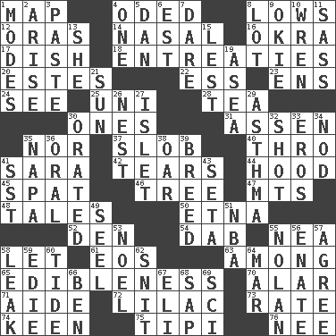 ACROSS 1. Atlas unit 4. Wrote a lyric poem 8. Moos 12. Mouths or openings 14. Relating to the nose 16. Gumbo ingredient 17. Food container 18. Pleas 20. _____ Park, CO 22. Curvy letter 23. Followers of ems 24. Perceive with the eye 25. Single; one (prefix) 28. Afternoon social gathering 30. Singles 31. NE Netherlands city 35. Not either 37. Messy guy 40. Through, poetically 41. "Two Mules for Sister ____" 42. Rends 44. Parka part 45. Argument over a trivial matter 46. Relationship diagram 47. Mountains (abbr.) 48. Stories 50. Inactive volcano in Sicily 52. Lair 54. Small moist lump or mass 55. Teachers' org. 58. Allow 61. Greek goddess of the dawn 63. Amid 65. The property of being fit to eat 70. Having or resembling wings 71. Helper 72. Pale purple color 73. Pace 74. Peachy ____! 75. Native american tent (variation) 76. Born DOWN 1. Methods 2. Originate 3. Thick mixture 4. Single 5. Daniel's nick name 6. Eastern Standard Time (abbr.) 7. Have the gumption 8. Car dealer's back yard 9. Migrant worker of the '30s 10. Songbird 11. Backtalk 13. A female animal or person 15. For fear that 19. Toward the sea 21. Player for Phoenix 26. A home for chicks 27. Small island 29. Respiratory problem 30. Declaimed 32. Attempt 33. Greek god of love 34. Lower and raise head in agreement 35. California wine valley 36. Relating to the mouth 38. Boat paddle 39. A special lineage 41. Fast jet (abbr.) 43. Bristle 49. Stitch closed the eyes of (a falcon) 51. Basketball assoc. 53. Christmas carol 55. Pitcher Ryan 56. Maternal 57. Match 58. Path through which fluid escapes 59. Singer Brickell 60. Event that recurs at intervals 62. In a ____ (agitated or irritated) 64. Impair 66. Benjamin's nick name 67. Biblical high priest 68. Plant excrement 69. _-fi