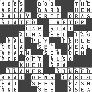ACROSS 1. Disorderly crowds 5. Sometimes accompanies a hiss 8. Definite Article 11. Type of rug 12. Sharp remark 14. Layer 15. Friendly 17. Algonquian 18. Mouths or openings 19. Scheduled 21. Portable computer 23. Infant locale 25. Narrow board 26. _ mater 27. Snakelike fish 28. Label 31. Actor Linden 33. Apply oneself diligently 35. Haggard of country music 37. Root beer relative 38. Arrange properly for use 40. Be tempered by heat 41. With great haste 43. Ocean 45. Lair 46. For each 47. Often (poetically) 50. In addition 52. Malaysian steamed pastry 53. Health resort 54. More lacking in sense or substance 56. Burned superficially 61. Naughty child 62. Habitations of wild animals 65. Monte _, Las Vegas Hotel/Casino 66. Erode 67. Observes 68. Romantic infatuation 69. Compass dir. 70. Observe 71. Toward the sea DOWN 1. Atlas contents 2. Of the mouth 3. Actor Lugosi 4. Table seasoning 5. English channel? 6. Rowing implement 7. Threatening words 8. Through, poetically 9. Pile 10. Followers of ems 13. Memphis, Tenn. Street 16. Shout 18. Baseball player Mel 20. Moist 22. Inside of hand 24. Friends 26. Mountain range southwest of Kyrgyzstan 28. Relationship diagram 29. Actor Alda or Thicke 30. Set 31. Dwelling 32. Having or resembling wings 34. It is so 36. Inside; within (prefix) 37. Head covering 39. Afternoon social gatherings 42. Part of speech 44. High mountains 48. Eats 49. Triplets 51. Ketch in the Levant 52. Krazy ___ of comics 54. SW Asia republic 55. Nathan's nickname 57. California wine valley 58. Pate de foie ____ 59. Otherwise 60. Capital of the state of Qatar 61. Benjamin's nick name 63. Born 64. Compass dir.