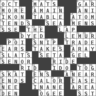 ACROSS 1. Sep. follower 4. Floor coverings 8. Slender fish 11. Greater amount 13. At full speed 15. Black tropical American cuckoo 16. Image 17. Eating place 18. Tiny particle 19. Watches over 21. Ocean 22. Not women's 23. Compass dir. 24. Definite Article 27. Infant locale 29. Colored 30. Arboreal primate 34. Luau course 36. Clip 39. Exchange 40. Hearing organs 41. Receives possession of 43. Like ___ of sunshine 44. Narrow boards 46. Bristle 47. Set 48. Sir (Sp.) 49. Travel on or in a vehicle 51. To free from 53. Wedding promise 54. Coat; cloak 57. Three-handed card game 60. Followers of ems 63. Approach 65. Extremities 66. Bodily heat indicating an inflammation 69. Relaxation 70. Born 71. Empty; void 72. Type of rug 73. Lair 74. Double curve, resembling the letter S 75. Fast jet (abbr.) DOWN 1. Leaves out 2. Popular sodas 3. Marketplace scale 4. Floor covering 5. Housemaid (var.) 6. Bar bills 7. Filth; sediment 8. Yard entry 9. At once, immediately (arch.) 10. Basketball hoops 12. Conclude 14. Actress Patricia 18. Electrical Measurement 20. Filthy place 25. Behest 26. Ferber et al. 28. Keyboard modifier key 29. What propaganda does 31. Female horse 32. Hereditary estate 33. Marina Del _, California 34. Light colored 35. NW Algerian seaport 37. Mamie's mate 38. _ dish (used to culture cells) 40. Curvy letter 42. Alleged 45. _ Lanka 50. ___ good deed 52. Tenth: prefix 54. Separates forcefully 55. Fertile tracts in a desert 56. Relatively large 57. Post 58. Leg joint 59. Arabian gulf 61. Billionth: prefix 62. Volcanic refuse 64. Teachers' org. 67. Single 68. Portuguese money of account (variant)
