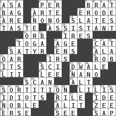 ACROSS 1. White ___ sheet 4. For each 7. Naughty child 11. Container for groceries 12. Johnson of "Laugh-In" 13. Eat (away) 14. "We ___ not amused" (Victoria) 15. Words to Nanette 16. Chalkboards 17. Clothes sense 19. Helper 21. Globe 23. Angers 24. Ancient Roman robe 25. Personal question 26. Domesticated feline 29. Man with strong sexual desires 30. Followers of ems 31. In the manner of 32. Boat paddle 33. Big collection agency 34. Director Reiner 35. It is 36. _-fi 37. A sleeping potion; an opiate (poet.) 40. Cards in a Roman deck? 41. Area sheltered from the wind 42. Billionth: prefix 43. Glance over 45. The first octave above the treble staff 46. Making a chance decision by using lots 51. Ms. Damita and namesakes 55. Foolish or stupid persons 56. Cause heat under the collar 58. Binary compound 59. Impressive in appearance 60. Came down and settled, as after flight 61. Last letter of the English alphabet 62. Celtic language 63. Perceive with the eye 64. Plant excrement DOWN 1. Blind as ____ 2. "Two Mules for Sister ____" 3. Eras 4. Adept person 5. Inactive volcano in Sicily 6. Vintage cars 7. Naughty children 8. Round or rotation of duties 9. Arabian gulf 10. Trial 12. Disorder of the immune system 13. Otherwise 16. Fathers 18. A blast of a horn 20. Signals 22. Soap unit 24. Tarsus (plural) 25. Nest on high 26. Monte _, Las Vegas Hotel/Casino 27. _ vera 28. Bar bill 29. Suttee (variant) 32. Petroleum 33. Ancient Celtic tribe of eastern Britain 36. Narrow boards 37. Heredity factor (abbr.) 38. Place for singles 39. Opposed to 43. Fur scarf 44. Quote 46. Trig term 47. Aroma 48. Chest bones 49. Mouths or openings 50. "Death on the ____" 52. Belonging to Elizabeth 53. The content of cognition 54. Ooze 57. Whopper