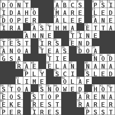 ACROSS 1. Do not 5. Lettered men learn these first 9. 23rd letter of the Greek alphabet 12. Potato state 14. Female horse 15. Directed 16. Drug addict 17. Toward shelter 18. A saturated hydrocarbon 19. Lyricist Gershwin 20. Respiratory problem 23. Singer James 24. Singer Murray 25. Prong on a fork 27. Trial 30. Big collection agency 32. Conclude 33. Small Philippine buffalo 34. Beverages made from leaves 36. ___ good deed 38. Girls' org. (abbr.) 39. Make a knot 40. Dreamland 43. Actress Charlotte 46. Flair 48. Grandmother 49. Strand of rope, yarn or thread 51. _-fi 52. Downhill vehicle 53. Citrus frut 54. Norwegian king 56. Portico 58. Frozen precipiation fell 61. Being at a high temperature 64. Greek goddess of the dawn 65. Halt 66. Sports stadium 68. Supplement with great effort 69. Remainder 70. Less widely known 71. For each 72. Angers 73. Inconspicuous attention getter DOWN 1. "You Light Up My Life" star Conn 2. Aroma 3. California wine valley 4. Definite Article 5. Housemaid 6. Lip ointment 7. Cause to be 8. Perceive with the eye 9. Food holder 10. Transmitted 11. The main thing one is thinking about 13. NW Algerian seaport 21. In a ____ (agitated or irritated) 22. Cigar-shaped 23. Inside; within (prefix) 24. _ moment's notice (2 wds.) 26. Working for oneself (abbr.) 27. Label 28. Followers of ems 29. Fly high 31. Moves on water 35. Manatee 37. Of or related to the anus 41. Single 42. June honoree 44. Capital of Western Samoa 45. Shade tree 47. "Death on the ____" 48. Science/research agcy. 50. Of or pertaining to yesterday 53. Failure 55. The sixth month of the Jewish calendar 56. Ooze 57. Casino tip 59. Characteristic smell of wine 60. Elects 61. Possessive pronoun 62. Singles 63. Small pie 65. _ Lanka 67. Reproach for some lapse or misdeed