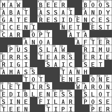 ACROSS 1. Informal term for the mouth 4. Fermented drink made from hops 8. Expressions of contempt or scorn 12. Blind as ____ 14. Slender Brazilian palm 16. "60 Minutes" Commentator Rooney 17. Yard entry 18. Homes 20. Ancient Celtic tribe of eastern Britain 22. Remaining after all deductions 23. Eastern Standard Time (abbr.) 24. Auto 25. Choose 28. _ moment's notice (2 wds.) 30. Small Philippine buffalo 31. Following 35. Fluid product of inflammation 37. Cole _ (cabbage dish) 40. Tall New Zealand timber tree 41. Blunders 42. Pulls apart 44. One of the Great Lakes 45. Swiss mountan, "Queen of the Mountains" 46. Ketch in the Levant 47. Arrange properly for use 48. Collect or gather 50. Hyperbolic tangent 52. Small child 54. Compass dir. 55. Single 58. Allow 61. Big collection agency 63. Make _____ (do battle with) 65. The property of being fit to eat 70. Slit 71. Trig term 72. Having threads 73. Introduce or present, as a question 74. Adolescent 75. Native american tent (variation) 76. For each DOWN 1. Mysterious quality of enchantment 2. Phillipine bananalike plant 3. Wetness 4. Oblong piece of solid material 5. Compass dir. 6. Curvy letter 7. Water falling in drops from the sky 8. Bar 9. At one time in the past 10. Lyric poems 11. System (abbr.) 13. "___ Little Indians" 15. The content of cognition 19. Singer James 21. Electrically charged atom 26. Mail 27. Lies 29. Anew 30. Help 32. Become fatigued 33. Give off 34. Regret 35. Demure 36. Capital and largest city of Mongolia 38. American Automobile Association (abbr.) 39. Compose 41. Period 43. Examine minutely or intensely 49. Land 51. ___ Haven, CT 53. Unclean, religiously 55. Fourth or lowest deck 56. Trap for birds or small mammals 57. Keyboard key 58. For fear that 59. Singer Brickell 60. Prong on a fork 62. In a ____ (agitated or irritated) 64. Cleo's killer 66. Benjamin's nick name 67. Connecticut Ivy Leaguer 68. Plant excrement 69. _ Lanka