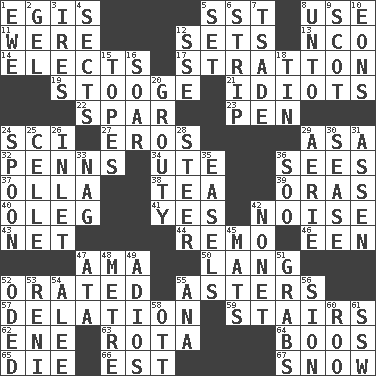 ACROSS 1. Armor plate that protects the chest 5. Fast jet (abbr.) 8. Purpose 11. Past tense of be (plural) 12. Arranges properly for use 13. Non-commissioned officer (abbr.) 14. Chooses 17. Ski resort town in Vermont 19. Moe Howard, for one 21. Foolish or stupid persons 22. Coast Guard woman 23. Fenced enclosure 24. _-fi 27. Greek god of love 29. White ___ sheet 32. Actor Sean's family 34. Shoshoni 36. Observes 37. Water jar 38. Afternoon social gathering 39. Mouths or openings 40. Cassini of fashion 41. Affirmative reply 42. Annoying sound 43. Remaining after all deductions 44. San ____ (Riviera town) 46. Car or cant ending 47. Nanny (var.) 50. Long (Scottish) 52. Spoke pompously 55. Michaelmas daisies 57. Conveyance 59. Flight of steps 62. Compass dir. 63. Roll call or roster of names 64. Scornful sounds 65. Expire 66. Eastern Standard Time (abbr.) 67. Overwhelm DOWN 1. She-sheep 2. Set 3. Angers 4. Religious groups 5. Arrange properly for use 6. Long narrow piece of something 7. Sadhe (variant) 8. To (old English) 9. Highlander 10. Immeasurably long periods of time 12. Compass dir. 15. Drinks excessively 16. Fly high 18. Shallow baking pan 20. Sulky 24. Soup utensil 25. Cell (Danish) 26. An arm off of a larger body of water 28. Bull 29. Nest on high 30. Gospel singer Marvin 31. NE Netherlands city 33. Tired old horse 35. Artist's stands 36. "Barney Miller" actor Jack 42. Music written for nine 45. Floor protectors 47. "One Day ___ Time" 48. Distance measurement (Brit.) 49. Goodbye (Sp.) 51. Takes hold of 52. Wrote a lyric poem 53. Painter Guido (1575-1642) 54. Toward shelter 55. Santa ___, CA 56. The Jewish people; Israel 58. Baseball player Mel 60. Friend of Pooh 61. Compass dir.