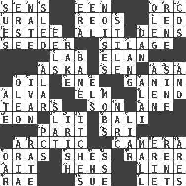 ACROSS 1. Elected reps. 5. Car or cant ending 8. The grampus (Milton) 11. Mountain range 12. Vintage cars 14. Directed 15. First name in cosmetics 17. Set down 18. Hiding places for outlaws 19. Sowing specialist 21. Fodder prepared in a silo 23. Experiment locale 25. Flair 26. "____ silly question..." 27. Elected rep. 28. White ___ sheet 31. Petroleum 33. Compass dir. 35. Homeless child 37. Inventor's middle name 38. Shade tree 40. Grant temporary use of 41. Lacerates 43. Male offspring 45. A saturated hydrocarbon 46. Period of immesurable duration 47. Cards in a Roman deck? 50. Indonesian resort city 52. Role in a play 53. _ Lanka 54. Northern region 56. Device for capturing images 61. Mouths or openings 62. "______ My Girl" (Turtles hit) 65. Less widely known 66. Small island 67. Folds over and sews together 68. Actor's bit 69. Actress Charlotte 70. Take to court 71. Allows DOWN 1. Institutes legal proceedings 2. Celtic language 3. Nathan's nickname 4. Downhill vehicle 5. Period 6. Snakelike fish 7. Annoying sounds 8. Cassini of fashion 9. French philosopher Descartes 10. Music discs 13. Vertical member of a panel or frame 16. Snakelike fish 18. Daniel's nick name 20. Immoral or dissolute person 22. Austrian-born American filmmaker Fritz 24. Object of repulsion 26. Having or resembling wings 28. So be it 29. Trig term 30. Added to 31. Margarine 32. _ the terrible 34. Raised railways 36. Jai _ 37. Had dinner 39. Crowds into 42. Narrow board 44. Drug cop 48. From or relating to Ireland 49. Skin irritations 51. One who doesn't tell the truth 52. Personal Computers (abbr.) 54. Roberta Peters solo 55. Pace 57. Shopping center 58. One of the Great Lakes 59. Monthly bill 60. Ancient Greek god of war 61. Rowing implement 63. Australian flightless bird 64. Compass dir.