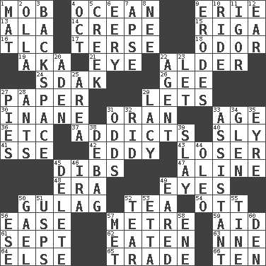 ACROSS 1. Crowd into 4. Sea 9. 4th largest of the Great Lakes 13. Wing 14. Streamer paper 15. Port city in Latvia 16. Affectionate concern, for short 17. Laconic 18. Aroma 19. Alias (abbr.) 21. Sight organ 22. Tree or shrub in the Birch family 24. Neighbor of Neb. 26. Unit of force equal to gravity 27. Some stationery 29. Allows 30. Empty; void 31. NW Algerian seaport 33. Ripen 36. And so on (abbr.) 37. Inveterate users 40. Roguish 41. Compass dir. 42. Whirlpool 43. Failure 45. Rights 47. Place in a line 48. Epoch 49. Snake ____ (dice throw) 50. Russian prison camp 52. Afternoon social gathering 54. Baseball player Mel 56. Relaxation 57. Distance measurement (Brit.) 59. Assist 61. Back-to-school mo. 62. Ingested 63. Compass dir. 64. Otherwise 65. Exchange 66. "___ Little Indians" DOWN 1. Floor covering 2. Water jar 3. Keyboard key 4. Sep. follower 5. Small stream 6. Suggestive of the supernatural 7. Domed church section 8. Born 9. Eats (away) 10. Travel on or in a vehicle 11. Composer Stravinsky 12. Hearing organ 20. An important port of Yemen 22. Rep 23. Allow 25. Type of rug 27. Sliced desserts 28. Pismires 29. Made of lace 31. Likelihood 32. To free from 33. Helper 34. Small, secluded valley 35. Jane of fiction 38. Debunk (Brit. slang) 39. Kill 44. Butter sub 45. Keyboard key 46. Retirement account (abbr.) 49. Having ears or earlike features 50. Highlander 51. United States Postal Service (abbr.) 52. Separate forcefully 53. Singer James 55. Prong on a fork 56. Compass dir. 57. Was introduced to 58. Compass dir. 60. Lair