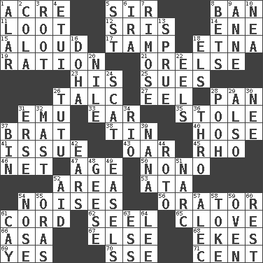 ACROSS 1. Measure of real estate 5. Title for a knight 8. Forbid 11. Plunder 12. Indian titles of respect 14. Compass dir. 15. Verbally 17. Pack (down) 18. Inactive volcano in Sicily 19. Food allowance for one day 21. Threatening words 23. Part of HMS, perhaps 25. Institutes legal proceedings 26. Baby powder 27. Snakelike fish 28. Baking dish 31. Australian flightless bird 33. Hearing organ 35. Took without asking 37. Naughty child 38. Metal container 40. Flexible conduit 41. Come out of 43. Rowing implement 45. 17th letter of the Greek alphabet 46. Remaining after all deductions 47. Ripen 50. Words to Nanette 52. Type of rug 53. "One Day ___ Time" 54. Annoying sounds 56. Speaker 61. Drawstring 62. Stitch closed the eyes of (a falcon) 65. Garlic unit 66. White ___ sheet 67. Otherwise 68. Supplements with great effort 69. Consenting reply 70. Compass dir. 71. Penny DOWN 1. Having or resembling wings 2. Root beer relative 3. Carrot, for example 4. Needle case 5. Fast jet (abbr.) 6. Lyricist Gershwin 7. Full of chinks, cracks, or crevices 8. Stakes 9. Singer Murray 10. Teachers' org. 13. Disorder 16. Capital of the state of Qatar 18. Raised railways 20. "Death on the ____" 22. Snakelike fish 24. Leave at once 26. Ballerina skirt 28. "Silly old bear" 29. In addition 30. Born 31. Celtic language 32. Vertical spar for supporting sails 34. River (Sp.) 36. Through, poetically 37. Storage container 39. Grandmother 42. Hearing organs 44. Printing process, for short 48. Honkers 49. Artist's stands 51. Drug cop 52. Assist 54. Olfactory organ 55. Mouths or openings 57. Actor Baldwin 58. Casino tip 59. Baking chamber 60. Relief 61. Island 63. Curvy letter 64. Area sheltered from the wind