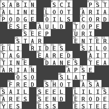 ACROSS 1. Unit of acoustic absorption 6. _-fi 9. Pacific Standard Time (abbr.) 12. Place in a line 13. Plunder 14. Roberta Peters solo 15. Porridge 16. Lubricates 17. Drawstring 18. Compass dir. 19. Old (Scot.) 20. Drink excessively 21. Ooze 23. RI univ. 24. Play the lead 25. Keyboard key 28. Biblical high priest 30. Amusement-park features 34. Grain storage tower 35. Label 36. Having ears or earlike features 38. Small island 39. Prong on a fork 41. Natives or inhabitants of Denmark 43. Beverage made from leaves 44. Believer in; advocate of (suffix) 46. Domed church section 48. Bear (Spanish) 49. Narrow board 50. Flintstone 51. Guess 53. White ___ sheet 56. Move on water 57. Stitch closed the eyes of (a falcon) 58. Ms. Damita and namesakes 60. Ancient Greek god of war 61. Post 62. Eat (away) 63. Consenting reply 64. Curvy letter 65. First name in cosmetics DOWN 1. Plant excrement 2. _ vera 3. Auction offers 4. Eat 5. Born 6. The visible part of the earth's surface 7. Chilled 8. It is 9. Appease 10. Beget 11. Bit 13. Central Nebraska county 14. Oak nuts 19. Nest on high 20. Third day of the wk. 22. Hearing organ 24. Seigniories (variant) 26. Writer Wiesel 27. Roll call or roster of names 28. Singer James 29. Den 31. June honoree 32. Period 33. Elected rep. 37. Started a card game 40. Artist's stands 42. Health resort 45. Dreamland 47. Flight of steps 49. Disposed of to a purchaser 50. Conductor's collection 51. Observes 52. Coop moms 54. Narrow, elongated depression 55. Assistant 56. Declare 57. Compass dir. 58. Area sheltered from the wind 59. Observe
