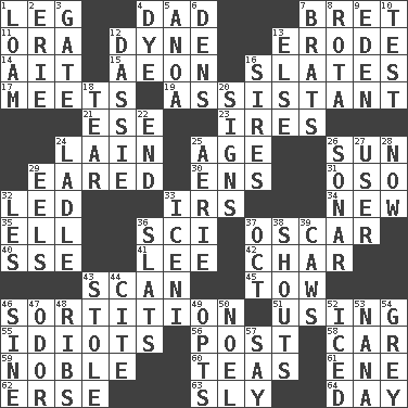 ACROSS 1. Part of a journey 4. Male parent 7. Cy Young winner Saberhagen 11. Mouth or opening 12. Centimeter-gram-second unit of force 13. Wear away 14. Small island 15. A really long time 16. Chalkboards 17. Confronts 19. Helper 21. Compass dir. 23. Angers 24. (Had) reclined 25. Personal question 26. Player for Phoenix 29. Having ears or earlike features 30. Followers of ems 31. Bear (Spanish) 32. Directed 33. Big collection agency 34. ___ Haven, CT 35. Pipe bend 36. _-fi 37. Motion picture award 40. Compass dir. 41. Area sheltered from the wind 42. Burn to charcoal 43. Glance over 45. Pull behind 46. Decision 51. Putting into practice 55. Foolish or stupid persons 56. Mail 58. Automobile 59. Impressive in appearance 60. Beverages made from leaves 61. Compass dir. 62. Celtic language 63. Stealthy 64. 24 hours DOWN 1. Rich soil 2. 4th largest of the Great Lakes 3. Yard entry 4. Color 5. Small Philippine buffalo 6. Cub Scout units 7. Naughty children 8. Round or rotation of duties 9. Genesis locale 10. Trial 12. Hyrax 13. Otherwise 16. Begets 18. Separate forcefully 20. Attaches a signature 22. Conclusion 24. Dipping utensil 25. Nest on high 26. Echolocation 27. One who uses or employs something 28. Immediately 29. Snakelike fish 32. French article 33. Ancient Celtic tribe of eastern Britain 36. Narrow boards 37. Sep. follower 38. Yells 39. Crow sounds 43. Fur scarf 44. Quote 46. Trig term 47. Aroma 48. Chest bones 49. Chooses 50. Christmas carol 52. On the rocks 53. Grandmother 54. Jennifer or Joel 57. Declare