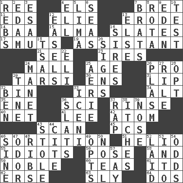 ACROSS 1. To sift 4. Raised railways 7. Cy Young winner Saberhagen 11. Begley and Asner 12. Writer Wiesel 13. Eat (away) 14. Sound made by sheep 15. _ mater 16. Chalkboards 17. Particles of soot 19. Aide 21. Observe 23. Angers 24. Shopping center 25. Ripen 26. Adept person 29. Tarsus (plural) 30. Followers of ems 31. Mouth edge 32. Storage container 33. Big collection agency 34. Keyboard modifier key 35. Compass dir. 36. _-fi 37. Remove soap 40. Remaining after all deductions 41. Area sheltered from the wind 42. Tiny particle 43. Examine hastily 45. Personal Computers (abbr.) 46. Making a chance decision by using lots 51. Sun: prefix 55. Foolish or stupid persons 56. Airs 58. Added to 59. Impressive in appearance 60. Beverages made from leaves 61. It would 62. Celtic language 63. Roguish 64. Two (Sp.) DOWN 1. Confederate soldiers (slang) 2. Dutch treat 3. He sold his birthright 4. Pipe bend 5. Pale green bean 6. Oceans 7. Naughty children 8. Roll call or roster of names 9. Paradise 10. Trial 12. Artist's stands 13. Otherwise 16. Begets 18. Russian ruler of old 20. Signals 22. Biblical high priest 24. French painter Edouard 25. Nest on high 26. Suffix with ecto or cyto 27. Cause heat under the collar 28. Elect 29. Prong on a fork 32. Benjamin's nick name 33. Ancient Celtic tribe of eastern Britain 36. Narrow boards 37. Reproach for some lapse or misdeed 38. Skin irritations 39. Olfactory organ 43. Fur scarf 44. Quote 46. Trig term 47. Aroma 48. Teases 49. Chooses 50. Christmas carol 52. Put down 53. To the inside or interior of 54. Probability 57. Declare