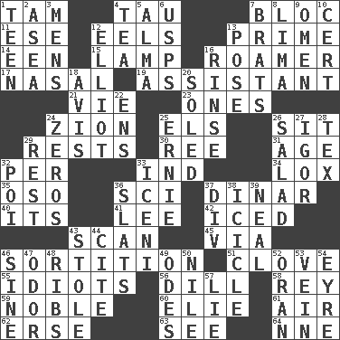 ACROSS 1. Scottish cap 4. The 19th letter of the Greek alphabet 7. Alliance 11. Compass dir. 12. Snakelike fish 13. First class 14. Car or cant ending 15. Desk light 16. Nomad 17. Relating to the nose 19. Aide 21. Compete 23. Washington bills 24. The Jewish people; Israel 25. Raised railways 26. Be seated 29. Musical pauses 30. To separate or throw off 31. Ripen 32. For each 33. Indiana (abbr.) 34. Brine-cured salmon 35. Bear (Spanish) 36. _-fi 37. Middle Eastern gold or silver currency 40. It is 41. Area sheltered from the wind 42. On the rocks 43. Examine minutely or intensely 45. By way of 46. Making a chance decision by using lots 51. Garlic unit 55. Foolish or stupid persons 56. Deli pickle 58. Marina Del _, California 59. Having high moral qualities 60. Writer Wiesel 61. Wind 62. Celtic language 63. Perceive with the eye 64. Compass dir. DOWN 1. Adolescent 2. Toward the sea 3. Not women's 4. Afternoon social gathering 5. _ mater 6. United States Postal Service (abbr.) 7. Naughty children 8. Pale green bean 9. Sign of things to come 10. Sure thing 12. American author Paul (1891-1958) 13. Introduce or present, as a question 16. Wash lightly 18. Advice 20. Having a sole or soles 22. Followers of ems 24. Nothings 25. Bert's buddy 26. Vegetable dish 27. Russian composer Stravinsky 28. John Ritter's dad 29. Remainder 32. Luau course 33. Ancient Celtic tribe of eastern Britain 36. Narrow boards 37. HTML Container Element 38. Tapering mass of hanging ice 39. Anneal 43. Fur scarf 44. Quote 46. Trig term 47. Aroma 48. Teases 49. Lyric poems 50. Mediterranean tributary 52. NW Algerian seaport 53. Distinctive style or manner 54. Jane of fiction 57. Whopper