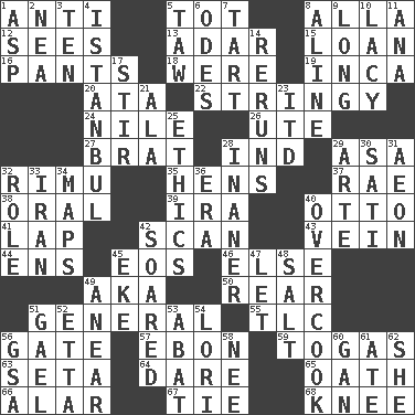 ACROSS 1. Against 5. Small child 8. Silent film actress Nazimova 12. Observes 13. The sixth month of the Jewish calendar 15. Grant temporary use of 16. Leg coverings 18. We are 19. South American Indian 20. "One Day ___ Time" 22. Slender, wiry 24. The longest river in the world 26. Shoshoni 27. Naughty child 28. Working for oneself (abbr.) 29. White ___ sheet 32. Tall New Zealand timber tree 35. Coop moms 37. Actress Charlotte 38. Relating to the mouth 39. Retirement account (abbr.) 40. "Beetle Bailey" pooch 41. Infant locale 42. Skim 43. Distinctive style or manner 44. Followers of ems 45. Greek goddess of the dawn 46. Otherwise 49. Alias (abbr.) 50. Bring up, as a child 51. Commissioned military rank 55. Affectionate concern, for short 56. Yard entry 57. Inky black, to poets 59. Ancient Roman robes 63. Bristle 64. Have the gumption 65. Pledge 66. Having or resembling wings 67. Make a knot 68. Leg joint DOWN 1. Cleo's killer 2. Teachers' org. 3. Nine, plus one 4. Byzantium, centuries later 5. The 23rd letter of the Hebrew alphabet 6. Lyric poems 7. Small pie 8. Place in a line 9. Protracted 10. Made of lace 11. Santa ___, CA 14. Summer TV shows 17. Tumult 21. Insect wing 23. It would 25. Value system 28. Sillier 29. Johnson of "Laugh-In" 30. Suttee (variant) 31. A really long time 32. Hero or heavy, e.g. 33. SW Asia republic 34. Atlas contents 36. Epoch 40. Burn the roast 42. Flew 45. Make supply last 47. Allow 48. Table seasoning 49. Approach 51. Highlander 52. Singer James 53. Blind as ____ 54. Australian parrot (variant) 56. Girls' org. (abbr.) 58. Born 60. Separate the seeds from cotton 61. Had dinner 62. A female animal or person