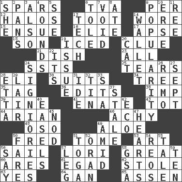 ACROSS 1. Practice fights 6. Federal power corp. 9. For each 12. Saint headwear 13. A blast of a horn 14. Had on 15. Follow as a consequence or result 16. Writer Wiesel 17. Domed church section 18. Male child 19. On the rocks 20. A slight indication 21. Food container 23. 100% 24. Fast planes 25. Lacerates 28. Biblical high priest 30. Sets or collections 34. Relationship diagram 35. Label 36. Prepares for publication 38. Mischievous child 39. Prong on a fork 41. Maternal 43. Small child 44. Believer in; advocate of (suffix) 46. Painful 48. Bear (Spanish) 49. Medicinal plant 50. Flintstone 51. Heavy book 53. Tate display 56. Move on water 57. Australian parrot (variant) 58. Relatively large 60. Ancient Greek god of war 61. Mild oath 62. Fur scarf 63. It is so 64. Separate the seeds from cotton 65. NE Netherlands city DOWN 1. A female animal or person 2. Zero-star reviews 3. In addition 4. Periods in a boxing match 5. Compass dir. 6. Lacquered or enameled metalware 7. Lacking any legal or binding force 8. Had dinner 9. Teen's desire 10. Celtic language 11. Portuguese money of account (variant) 13. Technical 14. Place for singles 19. Come out of 20. Domesticated feline 22. It is 24. Seigniories (variant) 26. San ____ (Riviera town) 27. Back-to-school mo. 28. Singer James 29. Den 31. Binary compound 32. Shallow baking pan 33. R.R. building 37. Lacking originality or spontaneity 40. Artist's stands 42. Environmental prefix 45. Dreamland 47. Centers of feelings and intuitions 49. Among 50. Conductor's collection 51. Ancient Roman robe 52. NW Algerian seaport 54. Vintage cars 55. Falsehood 56. Declare 57. Part of a journey 58. Girls' org. (abbr.) 59. "___ Little Indians"