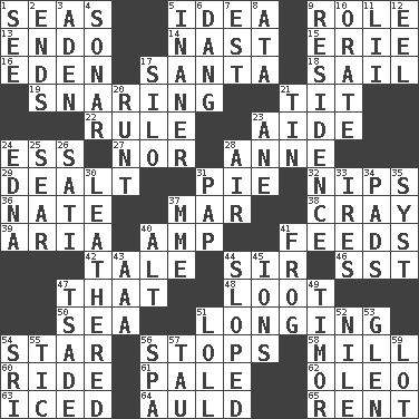 ACROSS 1. Oceans 5. The main thing one is thinking about 9. Hero or heavy, e.g. 13. Inside; within (prefix) 14. Political cartoonist Thomas 15. One of the Great Lakes 16. Paradise 17. Before Barbara or Clara 18. Travel by water 19. Catching in a trap 21. Teat (slang) 22. General guideline 23. Helper 24. Double-curved letter 27. And not 28. Singer Murray 29. Started a card game 31. Sliced dessert 32. Pinches, bites 36. Nathan's nickname 37. Third mo. 38. Supercomputer manufacturer 39. Roberta Peters solo 40. Electrical Unit 41. Eats 42. Story 44. Title for a knight 46. Fast jet (abbr.) 47. Not this but _ 48. Spoils 50. Ocean 51. Yearning 54. Play the lead 56. Constricts 58. Place where flour is made 60. Travel on or in a vehicle 61. Diluted with white 62. Margarine 63. On the rocks 64. Old (Scot.) 65. Monthly bill DOWN 1. Observe 2. Conclusions 3. Arabian gulf 4. Underwater navigation system 5. More empty; more void 6. Mild oath, euphamism for damn 7. Eastern Standard Time (abbr.) 8. "One Day ___ Time" 9. Home 10. Speak pompously 11. Cards in a Roman deck? 12. Snakelike fish 17. Grain storage tower 20. Undersized animal 21. Metal container 23. A saturated hydrocarbon 24. Pulitzer Prize-winning author Ferber 25. Singe 26. Suttee (variant) 28. Atmosphere 30. Resembling or made to resemble leather 31. Infant food 33. Angers 34. Groovy apts. 35. System (abbr.) 37. Madame (abbr.) 40. Keyboard modifier key 41. Tree-dwelling hopper 43. American Automobile Association (abbr.) 44. Inclined 45. Charged atoms 47. Sadhe (variant) 49. Southeast Indonesia island 51. Hang loosely or laxly 52. Mediterranean tributary 53. Small, secluded valley 54. _ Lanka 55. Nervous spasm 56. Health resort 57. The 19th letter of the Greek alphabet 59. Car dealer's back yard