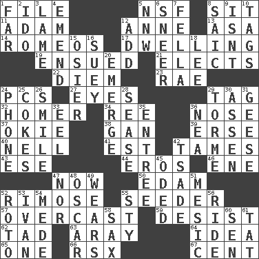 ACROSS 1. Do some clerical work 5. Science/research agcy. 8. Be seated 11. First of billions? 12. Singer Murray 13. White ___ sheet 14. Lover boys 17. Residence 19. Followed as a consequence or result 21. Opts 22. South Vietnam president (1954) 23. Actress Charlotte 24. Personal Computers (abbr.) 27. Sight organs 29. Label 32. Home run 34. Portuguese money of account (variant) 36. Olfactory organ 37. Migrant worker of the '30s 38. Separate the seeds from cotton 39. Celtic language 40. 1994 drama film starring Jodie Foster 41. Eastern Standard Time (abbr.) 42. Corrects by punishment or discipline 43. Compass dir. 44. Greek god of love 46. Compass dir. 47. At this time 50. Dutch treat 52. Full of chinks, cracks, or crevices 55. Sowing specialist 57. Cloudy 59. Stop 62. Small amount or degree 63. Like ___ of sunshine 64. It may be bright or harebrained 65. Single 66. Acura sports coupe 67. Penny DOWN 1. At a great distance 2. Wedding promise 3. Unable to walk 4. Make improvements or corrections to 5. Compass dir. 6. Contemptuous expression 7. Chap (slang) 8. Ketch in the Levant 9. Is not 10. Labels 12. Say or write further 15. Flexible twig of a willow tree 16. Chop _ 18. Area sheltered from the wind 20. Develop 24. Give a jingle 25. Popular sodas 26. Grin 28. Gospel singer Marvin 29. Singer Mel 30. NE Netherlands city 31. Honkers 33. Snakelike fish 35. Main course 36. Teachers' org. 42. Sadhe (variant) 45. Wrote a lyric poem 47. And not 48. Witty Wilde 49. Erodes 51. Mesonic 52. Printing process, for short 53. "Terrible" tsar 54. Ancient Persian 55. Filthy place 56. Travel on or in a vehicle 58. Saxophone 60. Elected rep. 61. Make lace