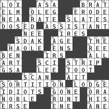 ACROSS 1. Brine-cured salmon 4. White ___ sheet 7. Naughty child 11. Shade tree 12. Cassini of fashion 13. Wear away 14. Teachers' org. 15. Pace 16. Chalkboards 17. Administered medicine 19. Helper 21. Born 23. Angers 24. Neighbor of Neb. 25. Grow older 26. Definite Article 29. White Person, in Hawaii 30. Followers of ems 31. Portuguese money of account (variant) 32. Benjamin's nick name 33. Big collection agency 34. 100% 35. Nonscientific branch of learning 36. _-fi 37. Remove all contents or possession from 40. Girls' org. (abbr.) 41. Area sheltered from the wind 42. A blast of a horn 43. Glance over 45. Small island 46. Conclusion 51. Cabin 55. Foolish or stupid persons 56. Went 58. Mouth or opening 59. Having high moral qualities 60. The smallest animal of a litter 61. Part of HMS, perhaps 62. Celtic language 63. Compass dir. 64. One (Scot) DOWN 1. Grant temporary use of 2. Butter sub 3. Dec. holiday 4. In the manner of 5. Stalk of a moss capsule 6. Eras 7. Naughty children 8. Round or rotation of duties 9. Arabian gulf 10. Trial 12. Severe or trying experience 13. Otherwise 16. Founders of families 18. Inside; within (prefix) 20. Attaches a signature 22. Supplement with great effort 24. Before Barbara or Clara 25. Nest on high 26. Distinguishing feature 27. Assist 28. Snakelike fish 29. Possessive pronoun 32. Paper or plastic container 33. Ancient Celtic tribe of eastern Britain 36. Narrow boards 37. R.R. building 38. Rest room 39. Printing process, for short 43. Fur scarf 44. Quote 46. Trig term 47. Aroma 48. Teases 49. Legendary monster 50. Part of speech 52. Capital of the state of Qatar 53. Smile widely 54. Relaxation 57. Compass dir.