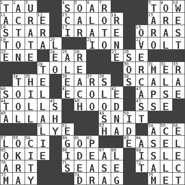 ACROSS 1. The 19th letter of the Greek alphabet 4. Fly high 8. Pull behind 11. Land measure 13. Bodily heat indicating an inflammation 15. "We ___ not amused" (Victoria) 16. Play the lead 17. Feeling or showing extreme anger 18. Mouths or openings 19. "_____ Recall" 21. Electrically charged atom 22. Electrical Unit 23. Compass dir. 24. Hearing organ 27. Compass dir. 29. Lacquered or enameled metalware 30. Channel Islands abalone 34. Definite Article 36. Hearing organs 39. Any of the three canals of the cochlea 40. The visible part of the earth's surface 41. Learning spot: Fr. 43. Domed church section 44. For Whom the Bell _____ 46. Parka part 47. Compass dir. 48. Assad's deity 49. In a ____ (agitated or irritated) 51. Sodium hydroxide 53. Possessed 54. Adept person 57. Locales 60. Republican Party 63. Artist's stand 65. Migrant worker of the '30s 66. Perfect 69. Small island 70. Tate display 71. Gospel singer Marvin 72. Baby powder 73. Fifth month 74. To draw with force 75. Was introduced to DOWN 1. Clothes sense 2. NE Massachussets city 3. A salt of uric acid 4. _-fi 5. Boat paddle 6. Jai ____ 7. Printing process, for short 8. Edible starchy tuberous root 9. Taken by mouth 10. Compass direction 12. Period 14. French philosopher Descartes 18. Cloudy 20. Lion 25. Toward shelter 26. Arrive at 28. Mayday 29. Copy Pinocchio 31. Atlas contents 32. Otherwise 33. Actress Charlotte 34. Instrument 35. Land elevation 37. Friend of Pooh 38. Make a splashing sound 40. R.R. building 42. Pulitzer Prize-winning author Ferber 45. Like a shrinking violet 50. Binary compound 52. The front part of a cuirass 54. Indian state 55. Cell (Danish) 56. Opt 57. Rich soil 58. Gumbo ingredient 59. Municipality 61. Wrote a lyric poem 62. Lightbulb-shaped fruit 64. Small island 67. White ___ sheet 68. Part of a journey