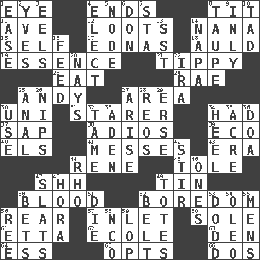 ACROSS 1. Sight organ 4. Extremities 8. Teat (slang) 11. "___ Maria" 12. Plunders 14. Nanny 15. Automatically 17. Ferber et al. 18. Old (Scot.) 19. Center 21. Likely to tip or tilt 23. Ingest 24. Actress Charlotte 25. Actor Griffith 27. Type of rug 30. University (slang) 31. A viewer who gazes fixedly 34. Possessed 37. Plant excrement 38. Goodbye (Sp.) 39. Environmental prefix 40. Raised railways 41. Makes clutter 43. Epoch 44. French philosopher Descartes 45. Lacquered or enameled metalware 47. Quiet! 49. Metal container 50. Vital fluid 52. Mood resulting from idleness 56. Hitchcock's "____ Window" 57. An arm off of a larger body of water 60. Not divided or shared with others 61. Singer James 62. Learning spot: Fr. 63. Lair 64. Double-curved letter 65. Elects 66. Two (Sp.) DOWN 1. Comfort 2. Jacques Cousteau's middle name 3. Snakelike fish 4. Choose 5. Thickened enlargement 6. Spanish title 7. R.R. building 8. Grayish beige 9. In an inward manner 10. Bit 13. Fast jet (abbr.) 14. California wine valley 16. Nourish 20. Negative votes 22. Lyricist Gershwin 25. Of or related to the anus 26. Pinches, bites 27. Ascend 28. Vintage cars 29. Celtic language 30. Purpose 32. Not wild 33. An important port of Yemen 34. The bottom of a shoe or boot 35. Measure of real estate 36. ___ good deed 42. Disorderly outburst 44. 17th letter of the Greek alphabet 46. Washington bills 47. Narrow boards 48. Israeli folk dance 49. Lugs 50. Stakes 51. Expire 52. Waist strap 53. Texas town _ City 54. Butter sub 55. Not women's 56. To separate or throw off 58. Non-commissioned officer (abbr.) 59. Chop off