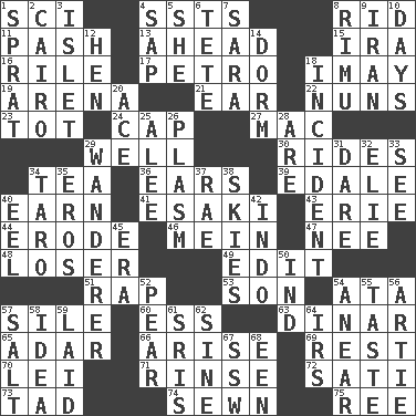 ACROSS 1. _-fi 4. Fast planes 8. To free from 11. Romantic infatuation 13. Toward the future 15. Lyricist Gershwin 16. Cause heat under the collar 17. Stone: prefix 18. "If ____ say so..." 19. Sports stadium 21. Ewer handle 22. Religious women 23. Small child 24. Head covering 27. Big _ 29. Water source 30. Amusement-park features 34. Beverage made from leaves 36. Hearing organs 39. Peak District village in England 40. Merit 41. 1973 Nobel Price Winner (Physics) Leo 43. 4th largest of the Great Lakes 44. Wear away 46. Count _ (2 wds.) 47. Born 48. Failure 49. Prepare for publication 51. Strike 53. Boy, to dad 54. "One Day ___ Time" 57. Drop; flow; fall 60. Double-curved letter 63. Middle Eastern gold or silver currency 65. The sixth month of the Jewish calendar 66. Originate 69. Remainder 70. Luau accessory 71. Remove soap 72. Suttee (variant) 73. Small boy 74. Stitched 75. Portuguese money of account (variant) DOWN 1. Small fatty European fish 2. Capital of Egypt 3. Small island 4. Plant excrement 5. A female animal or person 6. False hair 7. "Two Mules for Sister ____" 8. Tall New Zealand timber tree 9. SW Asia republic 10. 24-hour periods 12. Layer 14. Dormintory (informal) 18. Happening 20. Adept person 25. Toward shelter 26. Suffix with ecto or cyto 28. "We ___ not amused" (Victoria) 29. Roamer 31. Have the gumption 32. Writer Wiesel 33. Observe 34. Edible starchy tuberous root 35. Greek god of love 37. Actress Charlotte 38. Atmospheres 40. Snakelike fish 42. _ china 45. Period 50. Indiana (abbr.) 52. Lightbulb-shaped fruit 54. Approach 55. Clothes sense 56. Nick name for Arthur 57. Table seasoning 58. It may be bright or harebrained 59. Put down 61. Indian titles of respect 62. Trig term 64. Big collection agency 67. Compass dir. 68. Car or cant ending