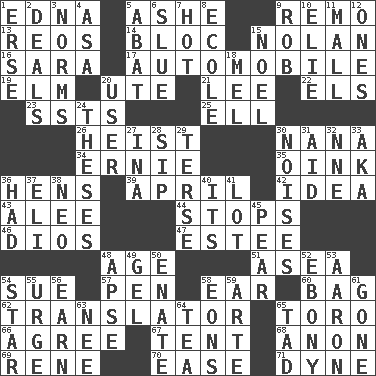 ACROSS 1. Pulitzer Prize-winning author Ferber 5. American tennis player Robert 9. San ____ (Riviera town) 13. Vintage cars 14. Coalition 15. Pitcher Ryan 16. "Two Mules for Sister ____" 17. Car 19. Shade tree 20. Shoshoni 21. Area sheltered from the wind 22. Raised railways 23. Fast planes 25. Pipe bend 26. Robbery 30. Nanny 34. Bert's buddy 35. Pig sound 36. Coop moms 39. Showery time 42. It may be bright or harebrained 43. Toward shelter 44. Constricts 46. "Vaya con ____" 47. First name in cosmetics 48. Ripen 51. At sea 54. Institute legal proceedings 57. Animal enclosure 58. Hearing organ 60. Paper or plastic container 62. Interpreter 65. "Corrida" creature 66. Match 67. Portable shelter 68. Soon (poet.) 69. French philosopher Descartes 70. Comfort 71. Centimeter-gram-second unit of force DOWN 1. Celtic language 2. Allots cards 3. Typical standards 4. White ___ sheet 5. Blind as ____ 6. Turn sharply 7. Being at a high temperature 8. Learning spot: Fr. 9. Director Reiner 10. Writer Wiesel 11. Shopping center 12. Singles 15. Christmas carol 18. Cartoonist voice _ Blanc 20. One who makes use of a thing 24. College papers 27. _ tizzy (2 wds.) 28. Small drink 29. Laconic 30. Annoying sounds 31. Help 32. Compass dir. 33. Alias (abbr.) 36. Possessed 37. Biblical high priest 38. Modern: prefix 40. It is 41. Car dealer's back yard 45. Lightbulb-shaped fruit 48. Domed church section 49. Set 50. Related on the mother's side 52. Dark wood 53. Composer Copland 54. Play the lead 55. Goad 56. Merit 58. Immeasurably long periods of time 59. Johnson of "Laugh-In" 61. Went 63. Born 64. Beverage made from leaves 65. Bit
