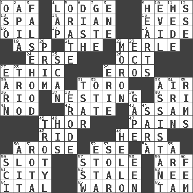 ACROSS 1. Clumsy lout 4. Inn 9. Cloth borders 13. Health resort 14. Believer in; advocate of (suffix) 15. Nights before holidays 16. Lubricate 17. Thick mixture 18. Helper 19. Cleo's killer 21. Definite Article 22. Haggard of country music 24. Celtic language 26. Sep. follower 27. Principle of right and wrong 29. Greek god of love 30. Odor 31. "Corrida" creature 33. Wind 36. River (Sp.) 37. Inhabiting a nest 40. Indian title of respect (Mr.) 41. Lower and raise head in agreement 42. Pace 43. Indian state 45. Son of Odin 47. Aches 48. To free from 49. Possessive pronoun 50. Came up 52. Compass dir. 54. "One Day ___ Time" 56. Slit 57. Took without asking 59. Sandy's bark 61. Municipality 62. Lacking originality or spontaneity 63. Born 64. Slanted text style (abbr.) 65. Make _____ (do battle with) 66. Scottish cap DOWN 1. Bear (Spanish) 2. Capital of Western Samoa 3. It jiggles the polygraph 4. Infant locale 5. Speak pompously 6. Food container 7. Yard entry 8. Compass dir. 9. Centers 10. Tending to cause great harm 11. Ancient Persian 12. Compass dir. 20. Demure 22. Person of subnormal intelligence 23. Environmental prefix 25. Glance over 27. Merit 28. Musical group of three 29. One of the Great Lakes 31. Russian ruler of old 32. Baseball player Mel 33. Aide 34. SW Asia republic 35. Basketball hoops 38. Wear away 39. Stare wonderingly 44. "Two Mules for Sister ____" 45. TNT 46. Part of HMS, perhaps 49. Phone greeting 50. Set down 51. Round or rotation of duties 52. Singer James 53. Fly high 55. Length times width 56. _-fi 57. Compass dir. 58. Car or cant ending 60. Opposite of masc.
