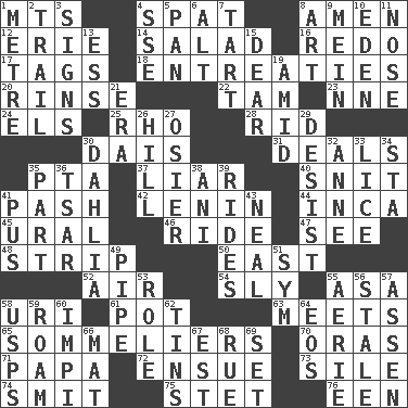 ACROSS 1. Mountains (abbr.) 4. Argument over a trivial matter 8. So be it 12. 4th largest of the Great Lakes 14. Vegetable dish 16. Do over again 17. Labels 18. Pleas 20. Remove soap 22. Scottish cap 23. Compass dir. 24. Raised railways 25. 17th letter of the Greek alphabet 28. To free from 30. Raised platform 31. Allots cards 35. Parent Teacher Association (abbr.) 37. One who doesn't tell the truth 40. In a ____ (agitated or irritated) 41. Romantic infatuation 42. Soviet premier 1918-24 44. South American Indian 45. Mountain range 46. Travel on or in a vehicle 47. Observe 48. Empty completely 50. 90 degrees 52. Atmosphere 54. Mischievous 55. White ___ sheet 58. RI univ. 61. Plant holder 63. Confronts 65. Wine waiters 70. Mouths or openings 71. Dad 72. Follow as a consequence or result 73. Drop; flow; fall 74. Stricken, poetically 75. Proofreading order 76. Car or cant ending DOWN 1. Distance measurement (Brit.) 2. Drop behind 3. Public displays of written messages 4. Compass dir. 5. Baking dish 6. The first octave above the treble staff 7. Small pie 8. Nonscientific branch of learning 9. Count _ (2 wds.) 10. Genesis locale 11. Characteristic smell of wine 13. Curvy letter 15. Letter starter 19. Among 21. Epoch 26. Land elevation 27. Flexible twig of a willow tree 29. Stop 30. A pale violet or amethyst color 32. Singer Murray 33. Louse (plural) 34. R.R. building 35. Piece 36. Russian ruler of old 38. Cuckoo 39. Amusement-park features 41. Product of festering 43. Actress Patricia 49. Corncob 51. Symbol (abbr.) 53. Hero or heavy, e.g. 55. Nest on high 56. Having lost freshness 57. NE Netherlands city 58. United States Postal Service (abbr.) 59. Wander 60. Body of Kaffir warriors 62. Airtight sealed metal containers 64. Greek goddess of the dawn 66. Floor protector 67. Eastern Standard Time (abbr.) 68. Regret 69. Arrange properly for use