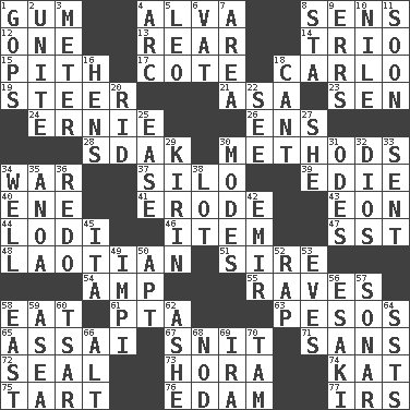 ACROSS 1. Chewing product 4. Inventor's middle name 8. Elected reps. 12. Single 13. Stern 14. Musical group of three 15. Heart or essence 17. ____ d'Azur (French Riviera) 18. Monte _, Las Vegas Hotel/Casino 19. Bull 21. White ___ sheet 23. Elected rep. 24. Bert's buddy 26. Followers of ems 28. Neighbor of Neb. 30. Modes 34. Armed conflict 37. Grain storage tower 39. Singer Brickell 40. Compass dir. 41. Eat (away) 43. Period of immesurable duration 44. Farming town in central California 46. Detail 47. Fast jet (abbr.) 48. Of or relating to Laos or its people 51. Title for a man of rank and authority 54. Electrical Unit 55. All-night dance parties 58. Erode 61. Parent Teacher Association (abbr.) 63. Mexican monetary units 65. Slender Brazilian palm 67. In a ____ (agitated or irritated) 71. Without 72. Lick closed 73. Israeli folk dance 74. Krazy ___ of comics 75. Small pie 76. Dutch treat 77. Big collection agency DOWN 1. Republicans 2. Join together 3. Distance measurement 4. Curve 5. Lion 6. Large container 7. Length times width 8. R.R. building 9. Blunders 10. The longest river in the world 11. Within a short period 16. Coop moms 18. Patter 20. To free from 22. Observe 25. Relaxation 27. A female animal or person 29. Japanese brewing company 30. Methods 31. Lyric poems 32. "Vaya con ____" 33. Posted 34. Water source 35. Small Philippine buffalo 36. Redecorate 38. Car dealer's back yard 42. Independent ruler or chieftain 45. Call ___ day 49. Body of Kaffir warriors 50. Fitting 52. Hit sharply and swiftly 53. Nights before holidays 56. 1973 Nobel Price Winner (Physics) Leo 57. Underwater navigation system 58. 90 degrees 59. Toward the sea 60. Russian ruler of old 62. American tennis player Robert 64. Fast planes 66. The first octave above the treble staff 68. Allow head to fall sleepily 69. Lyricist Gershwin 70. Scottish cap