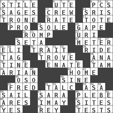 ACROSS 1. Vertical member of a panel or frame 6. Shoshoni 9. Personal Computers (abbr.) 12. Gurus 13. Group working together 14. Indian titles of respect 15. Heavy duty weighing machine 16. Assign a rank or rating to 17. Carry 18. Adept person 19. Not divided or shared with others 20. Stare wonderingly 21. Frolic 23. RI univ. 24. Bristle 25. Distance measurement 28. Connecticut Ivy Leaguer 30. Distinguishing feature 34. Travel on an animal 35. Label 36. Collection of objects 38. Santa ___, CA 39. Prong on a fork 41. Related on the mother's side 43. Scottish cap 44. Believer in; advocate of (suffix) 46. Dwelling 48. Bear (Spanish) 49. Trig term 50. Flintstone 51. Baby powder 53. White ___ sheet 56. Move on water 57. "Two Mules for Sister ____" 58. First-year military academy student 60. Ancient Greek god of war 61. "If ____ say so..." 62. Settings 63. Consenting reply 64. Marina Del _, California 65. Trials DOWN 1. Fast jet (abbr.) 2. Canvas cover 3. Russian composer Stravinsky 4. Poe poem 5. Compass dir. 6. Mountain range 7. Wig 8. She-sheep 9. Appease 10. Quote 11. Compass dir. 13. Riding implement 14. A viewer who gazes fixedly 19. Don Adams' spy role 20. Chewing product 22. Baseball player Mel 24. Seigniories (variant) 26. Pulitzer Prize-winning author Ferber 27. 480, 500 or 516 sheets of paper 28. Singer James 29. Den 31. "We ___ not amused" (Victoria) 32. Electrically charged atom 33. Federal power corp. 37. Moral principle 40. Artist's stands 42. A really long time 45. Dreamland 47. Ear of corn 49. Kill 50. Conductor's collection 51. Docile 52. Like ___ of sunshine 54. Puts into a specified state 55. Collude with 56. Declare 57. Title for a knight 58. Pacific Standard Time (abbr.) 59. Curvy letter